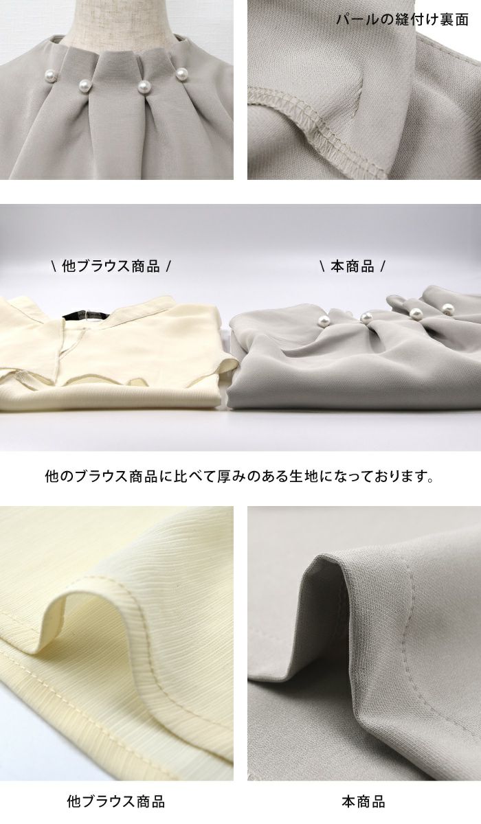 • 首元のタックとパールが目を惹くパールネックブラウス。