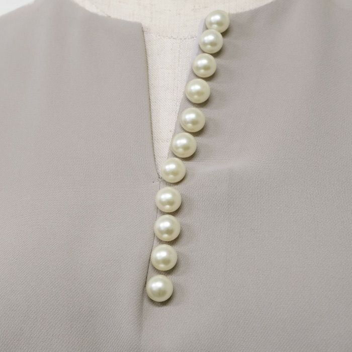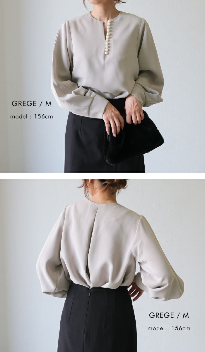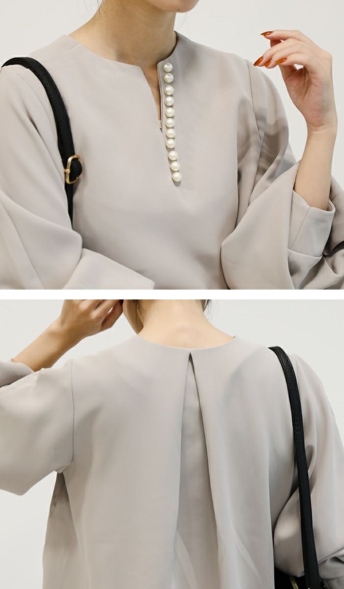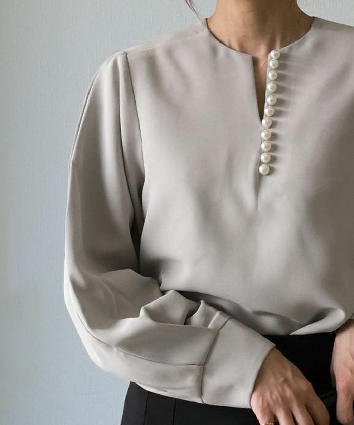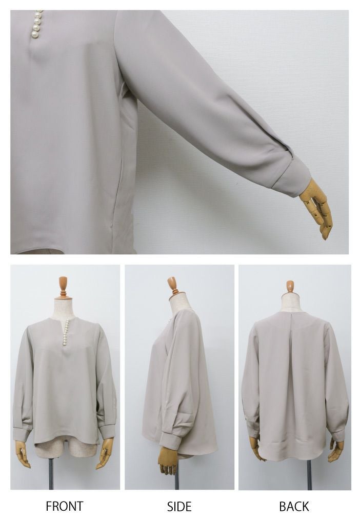 • ネックレスいらずの華やかなデザイン♪パール付きキーネックブラウス