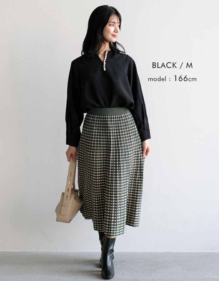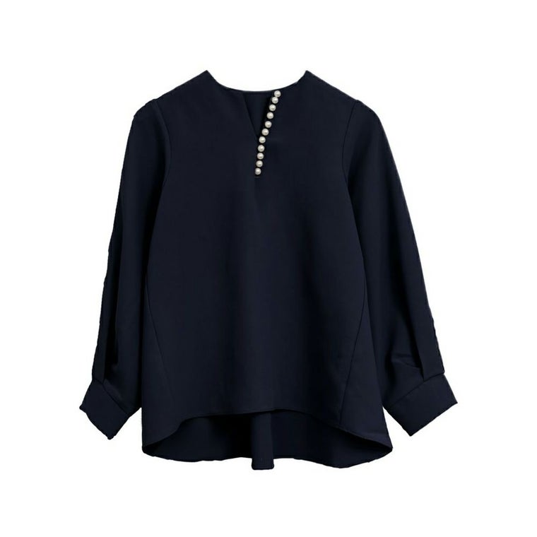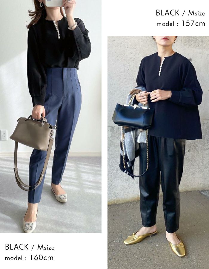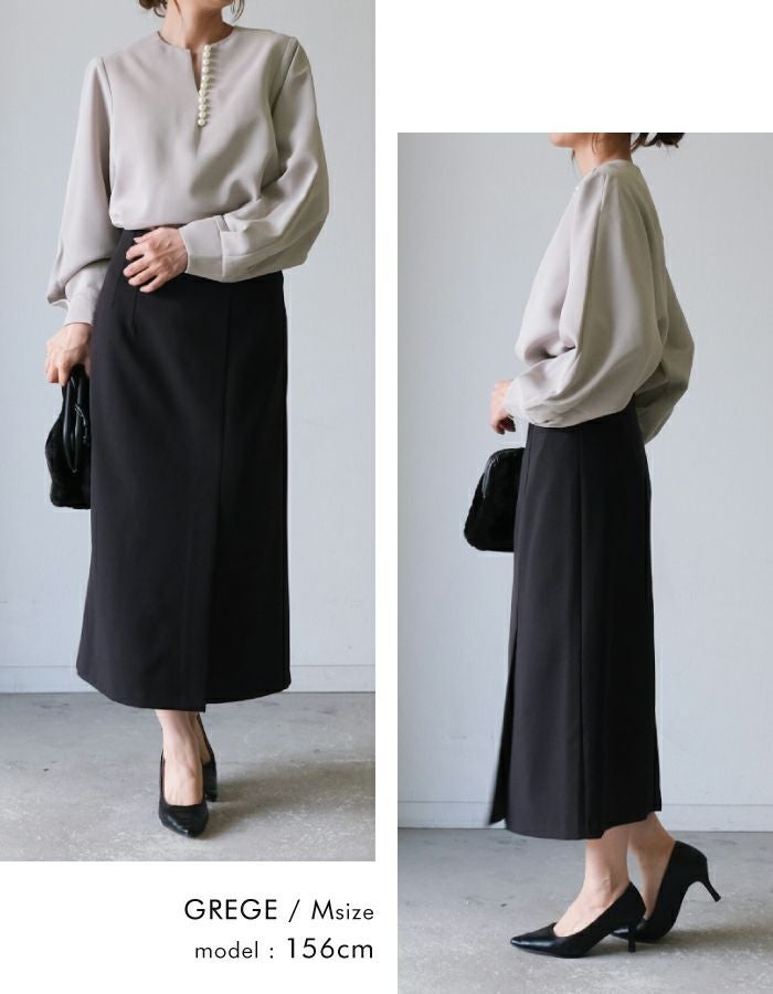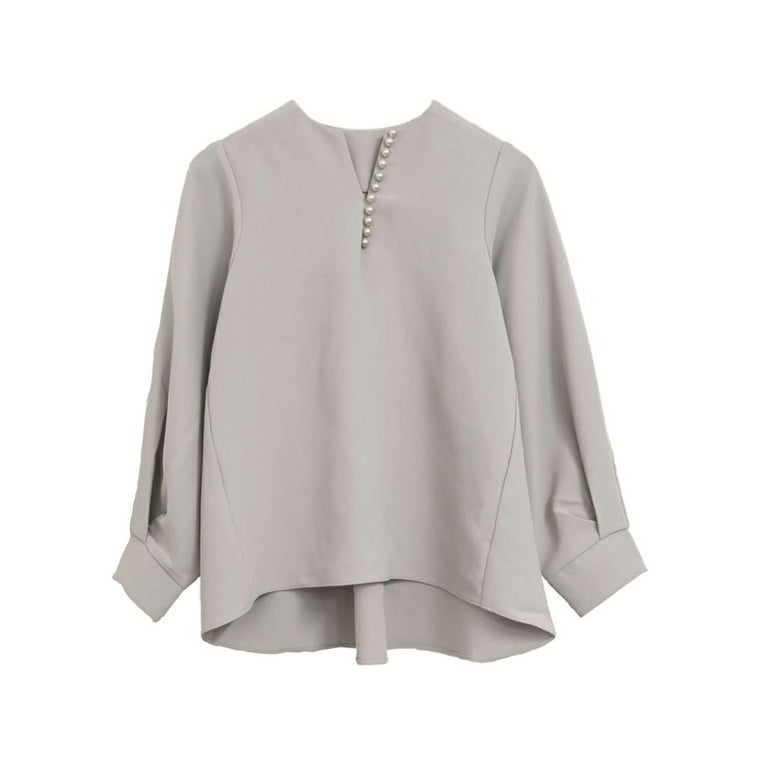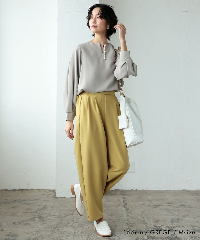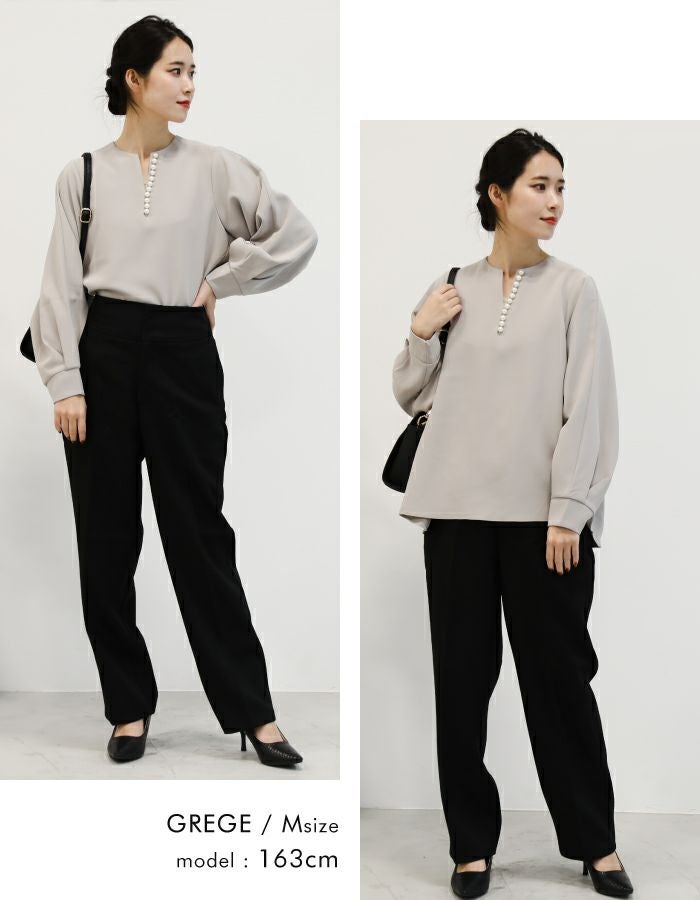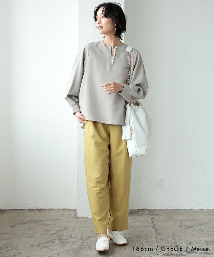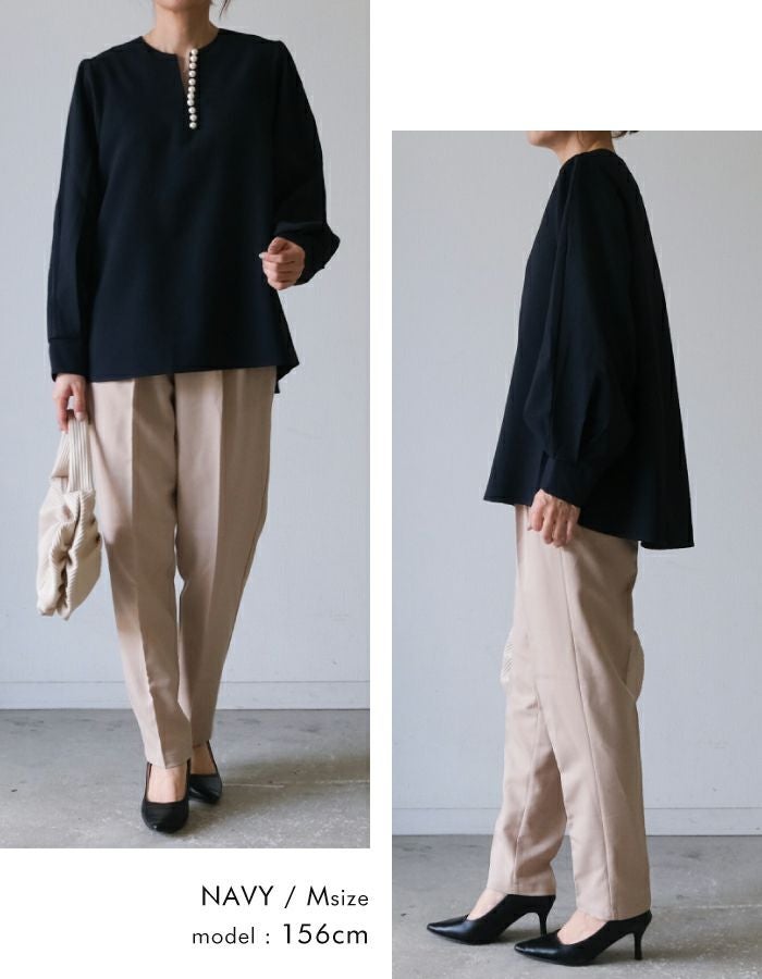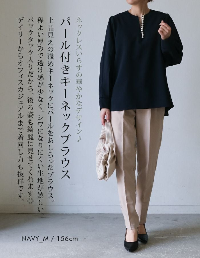 上品見えの浅めキーネックにパールをあしらったブラウス。 程よい厚みで透け感が少なく、シワになりにくい生地が嬉しい。 バックタック入りだから、後ろ姿も綺麗に見せてくれます◎ デイリーからオフィスカジュアルまで着回し力も抜群です。