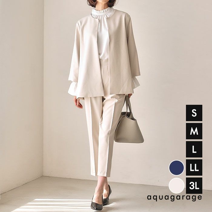 フレアシルエットでこなれ感を演出するセットアップスーツ。 ノーカラーで顔周りをスッキリ見せ、袖丈は抜け感が出るように、手首が見える長さにしました◎ 袖幅もゆったりしているので、中に着るトップスを選ばず、冬はニットを合わせることもできます。 パンツは楽ちんなバックゴムで、センタープレスで脚長効果も♪ お仕事から学校行事まで、どんなシーンにも活躍してくれます。