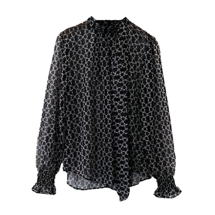 • 高級感ある総柄長袖ボウタイブラウス