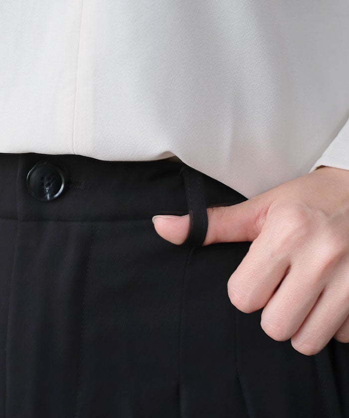 ボトムスはウエスト周りをすっきりとまとめつつ、程よいボリューム感で大人っぽい印象に。