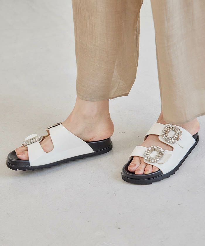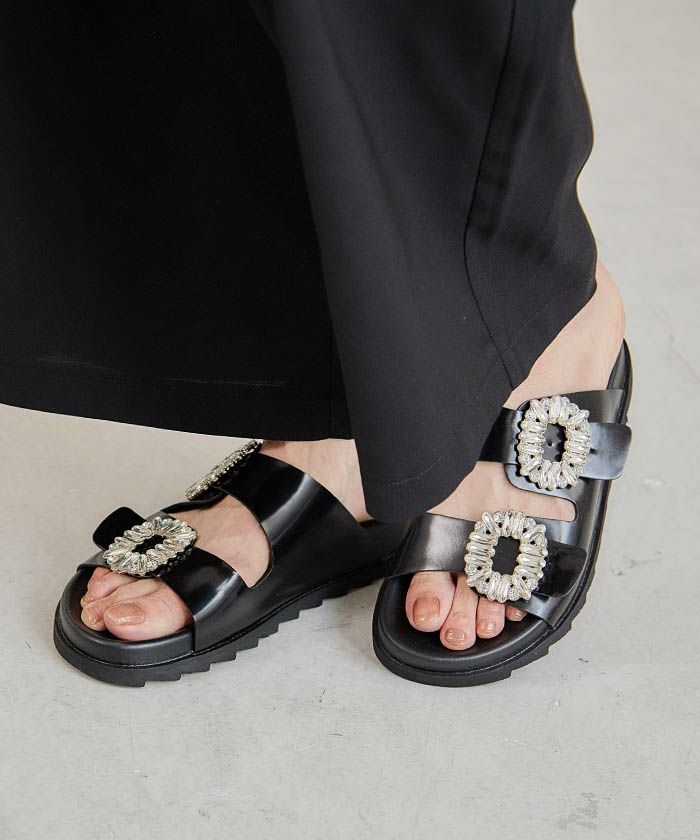 大きなビジューバックルが目を惹くダブルストラップサンダル。 インソールはクッション性があり、ふんわりソフトな履き心地。 ストラップでしっかりホールドされ、脱ぎ履きが簡単なのも◎