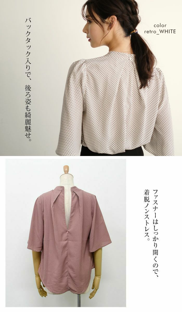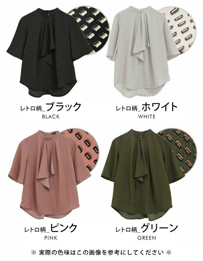 仕事用にレトロ柄ピンクを購入しました。 157cm、44kg、痩せ型で普段はSサイズを着ていますが、こちらの商品はSサイズがないのでMサイズ購入です。 洗濯後乾くのが早いしシワにもなりにくいので重宝しています。 ウエストインしてタイトスカートと合わせると上品に見えて気に入っています。 ただ、スカーフタイは折り返しで部分で一部布の裏が見えてしまいます。私が買ったレトロ柄ピンクは布の面裏の色の違いはっきり分かり、どうにも安っぽさを感じてしまうので、ベージュなど布の裏表で色味にあまり差がない色を選んだ方が良いかと思います。