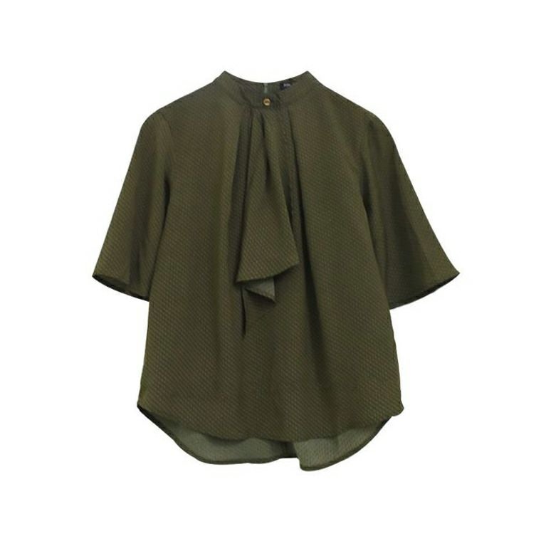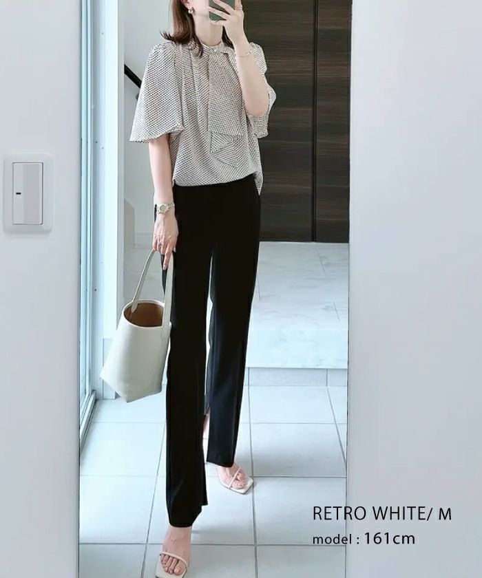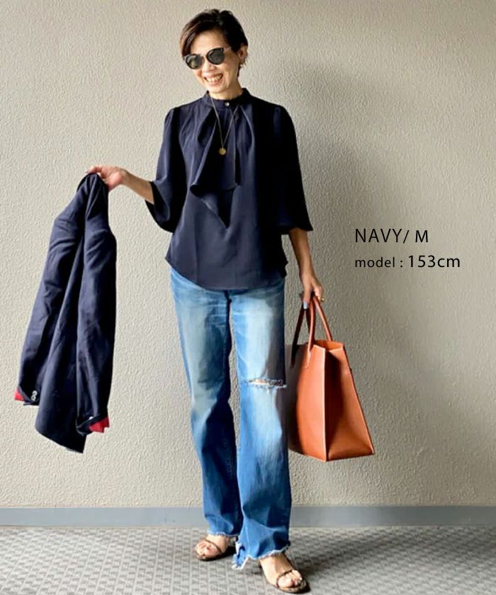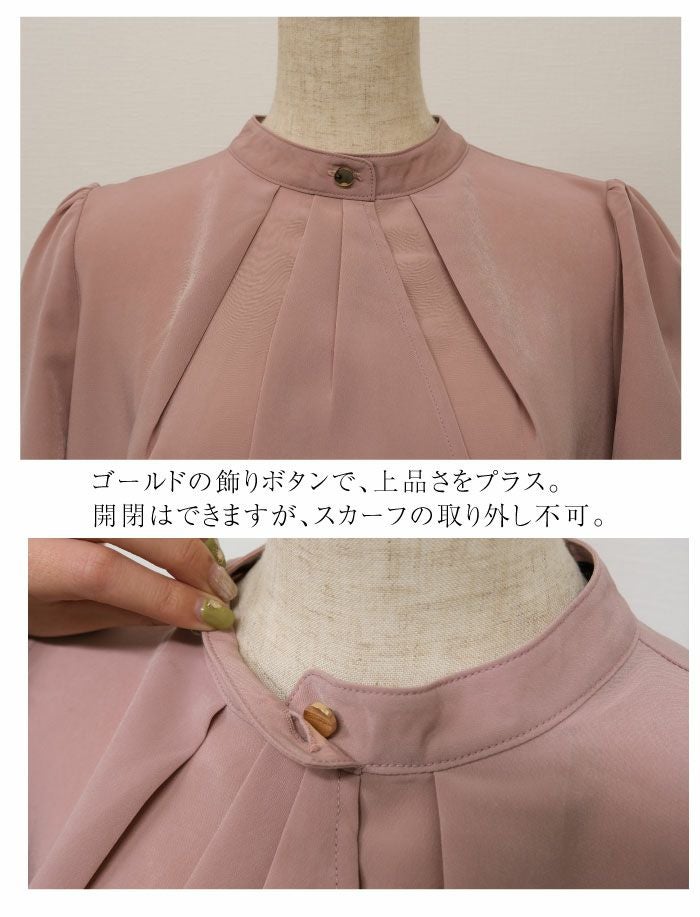 顔まわりを華やかに彩るスカーフタイ付きブラウス。