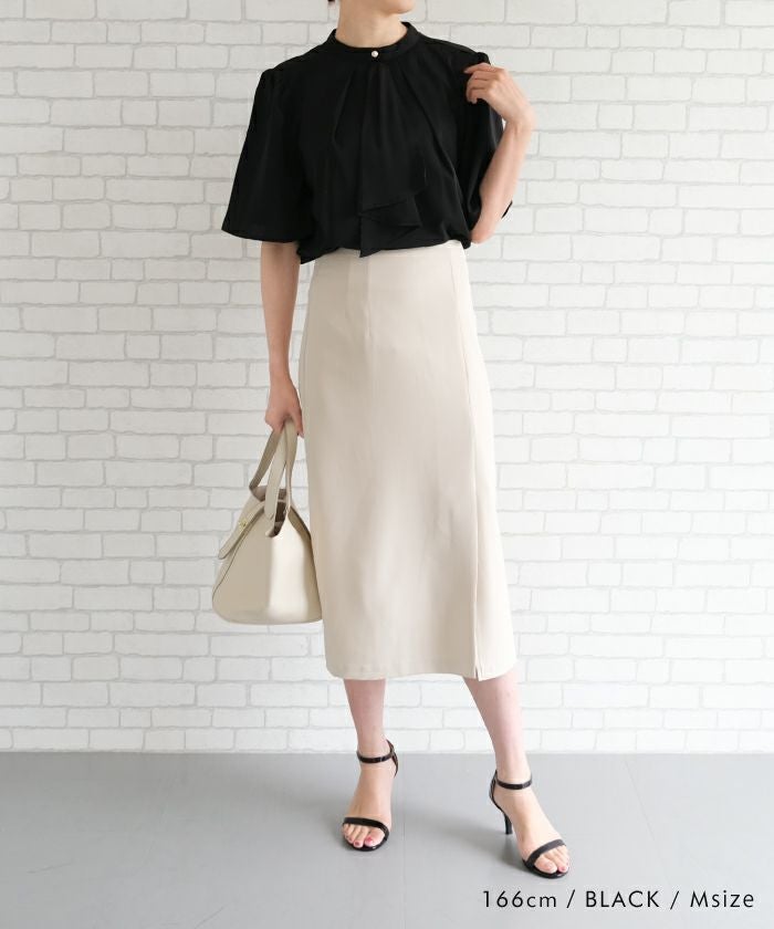 ふんわりとしたフレアスリーブが女性らしさを演出し、二の腕もさりげなくカバー。