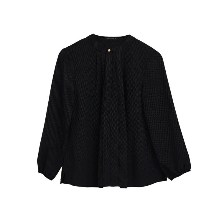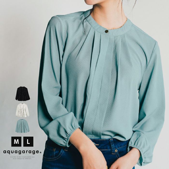 • スタンドカラーでフロントタックのシンプルなドット柄ブラウス。
