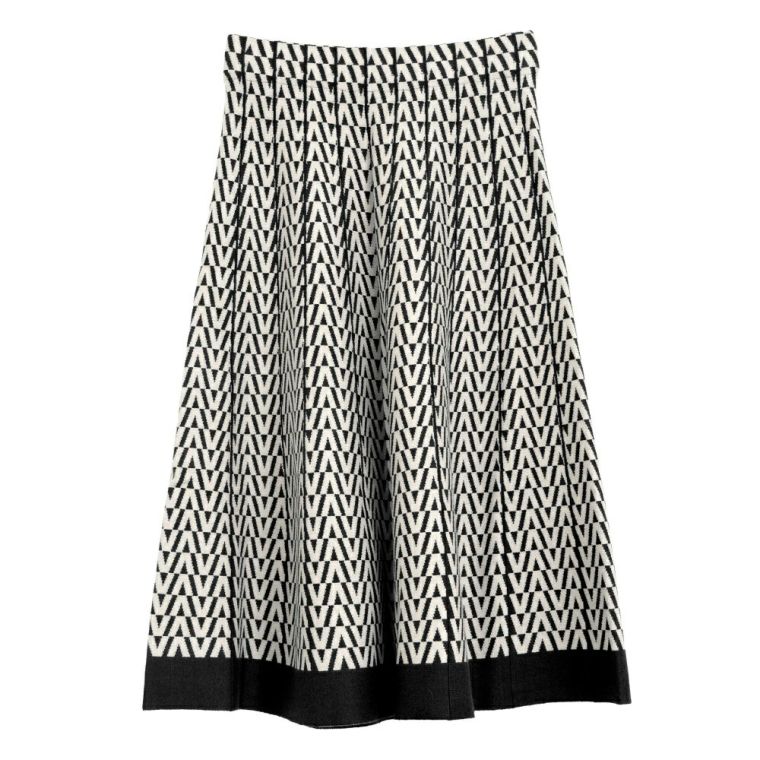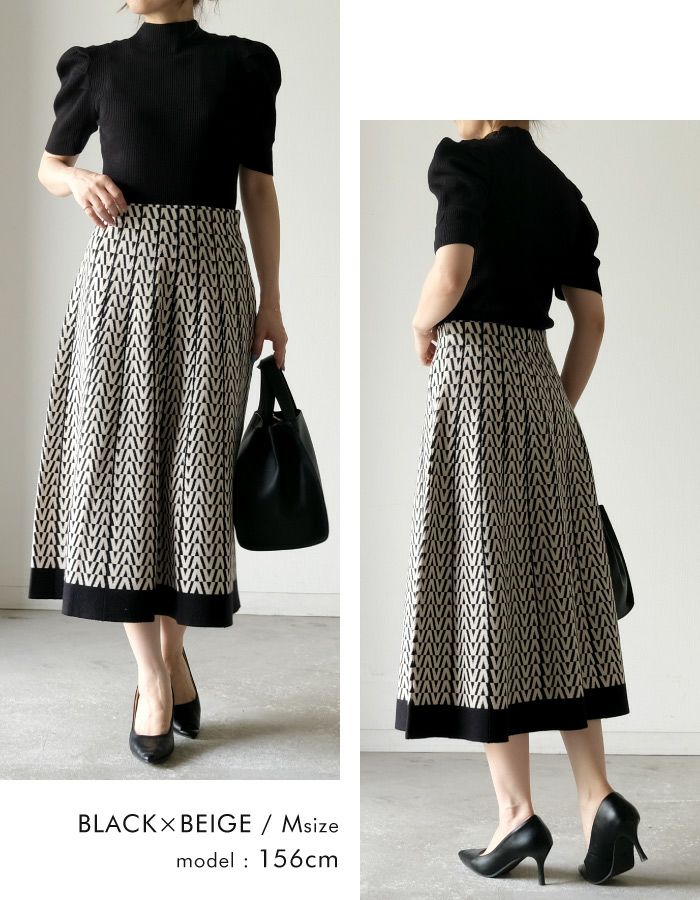幾何学柄が目を惹く、やわらかいニット生地のフレアスカート。 ウエストはゴム仕様で、リラックス感のある穿き心地もポイント。 着丈は長すぎず、足首をすっきりと見せてくれます。