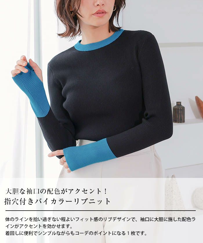 • 大胆な袖口の配色がアクセントの指穴付きバイカラーリブニット