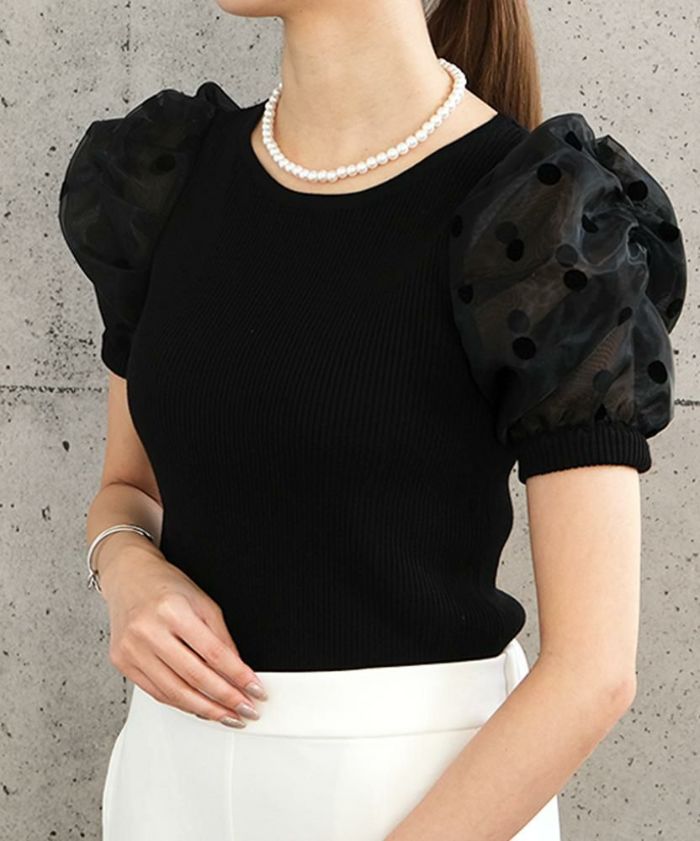 身頃には伸縮性抜群のリブニット素材を使用、袖にはオーガンジー素材のパフスリーブをドッキング。