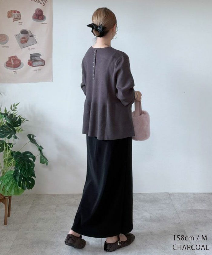 背中にあしらわれたパールボタンが、ふとした角度からエレガントな表情をのぞかせ、大人の女性らしさをひと押ししてくれます。