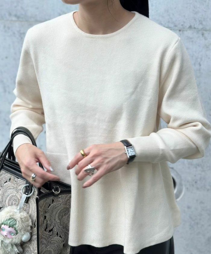 背後から見せる素敵な仕掛けが魅力の「バックパールフレアニットトップス」。