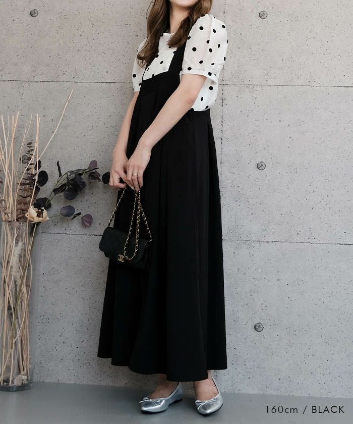 シンプルながらもアクセントを効かせるたっぷりめのタックと、 裾にかけて広がるフレアデザインが上品な雰囲気の女性らしい一着です。