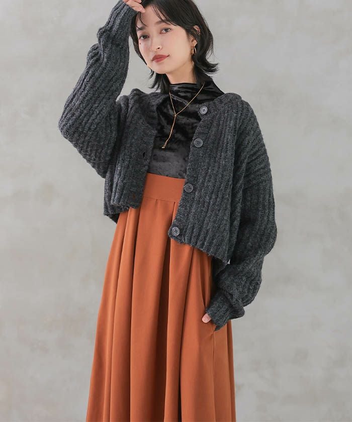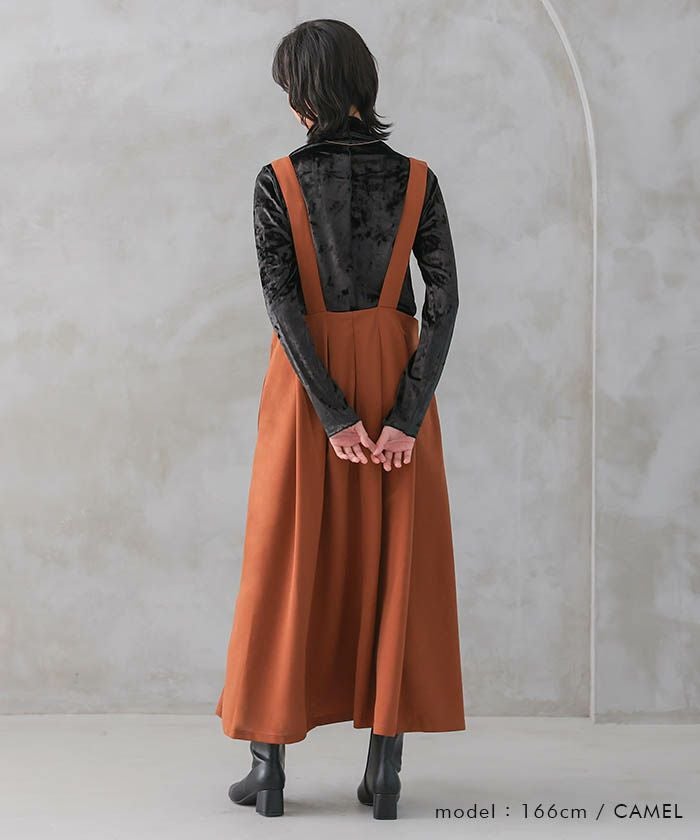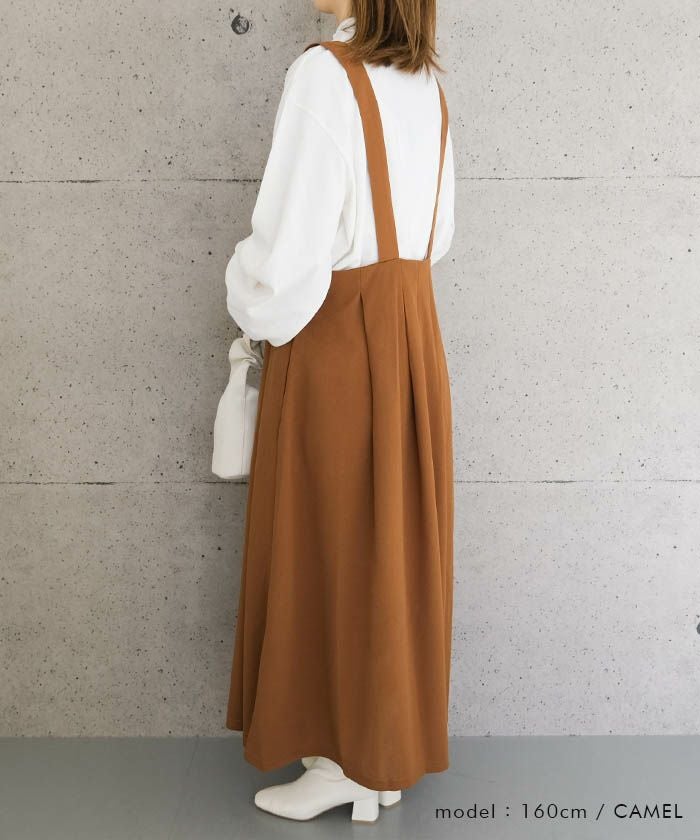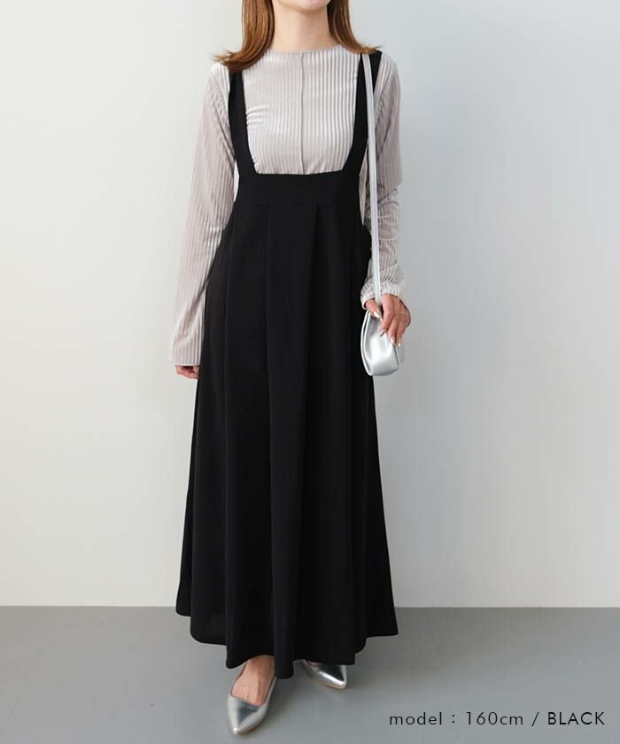 ロングスリーブのカットソーインナーやシャツ、リブニットなど、シンプルなトップスとも相性抜群。