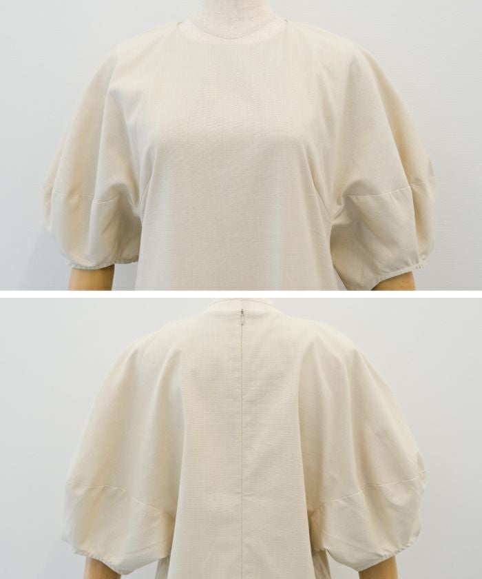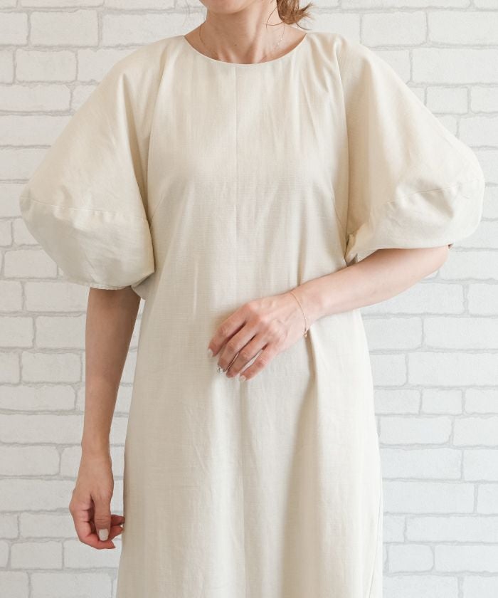 二の腕をしっかりカバーしてくれるバルーンスリーブのワンピース。