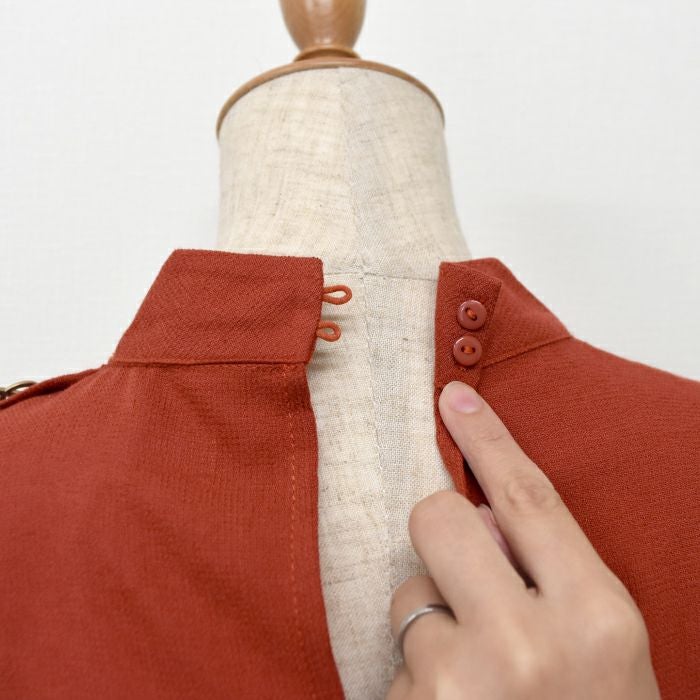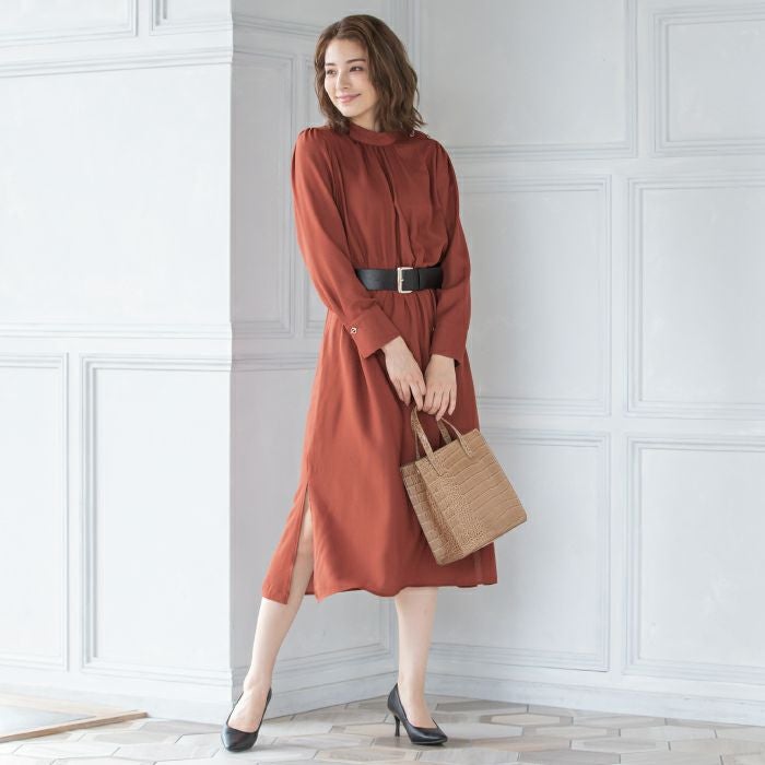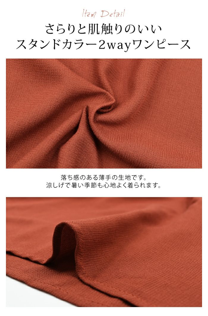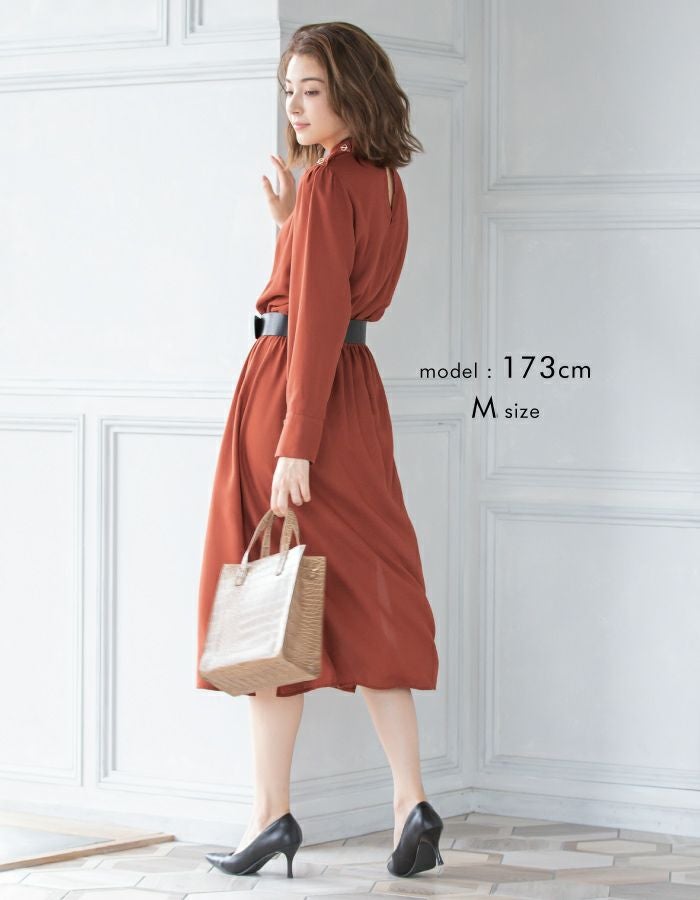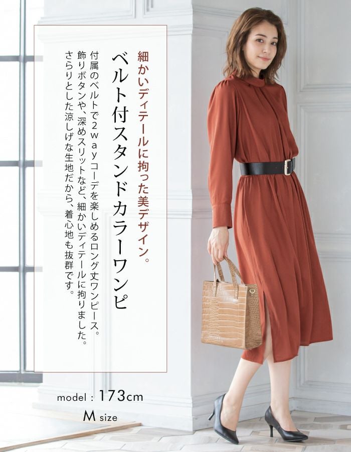 • 細かいディテールに拘った美デザイン、ベルト付スタンドカラーワンピ。
