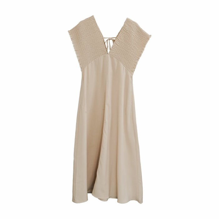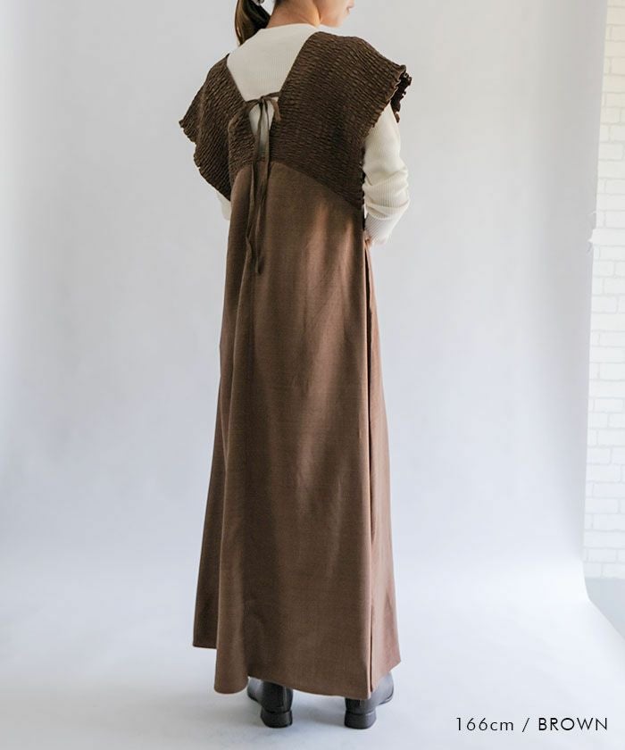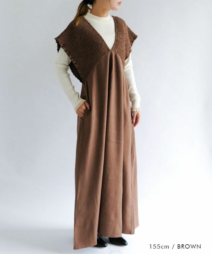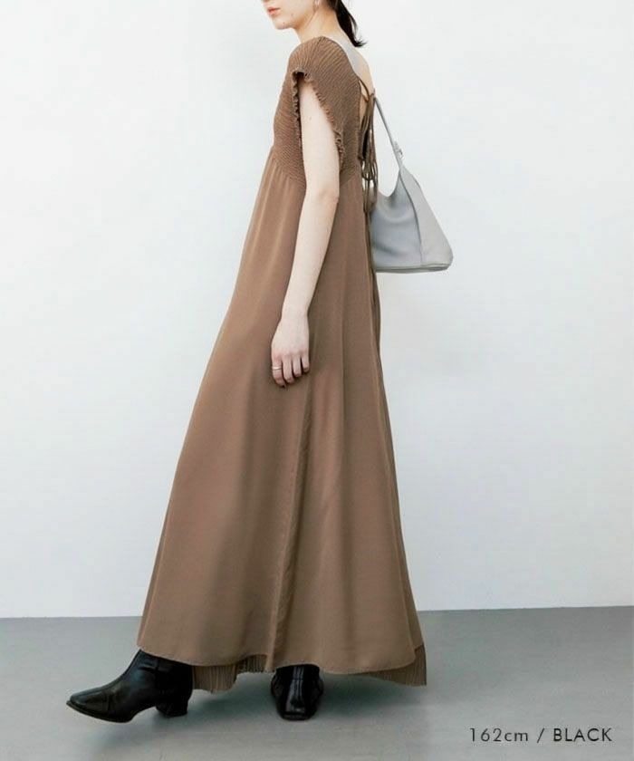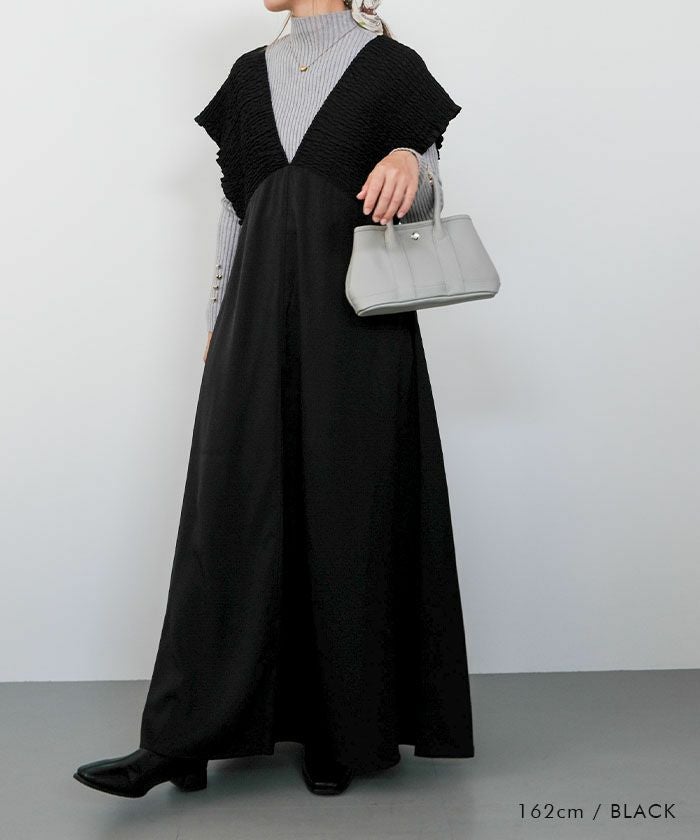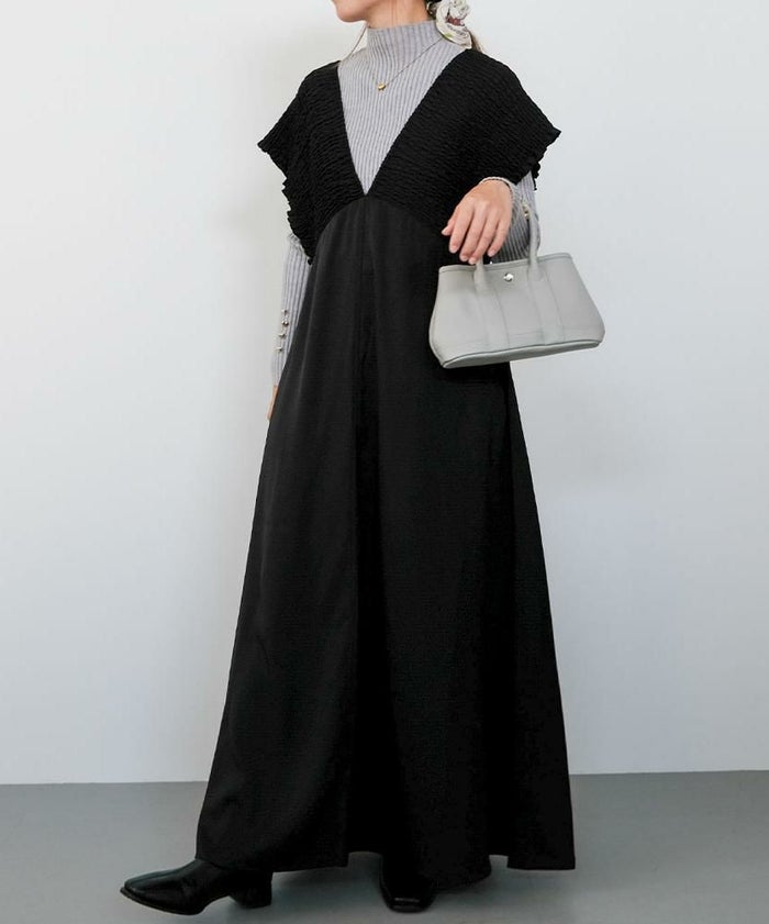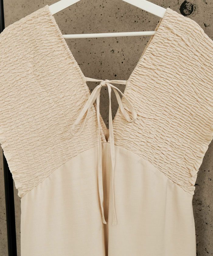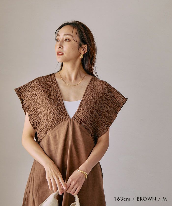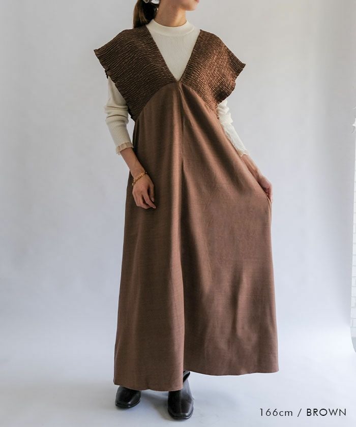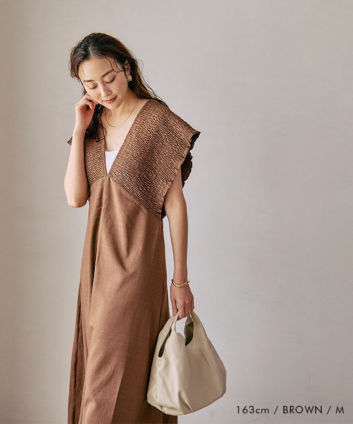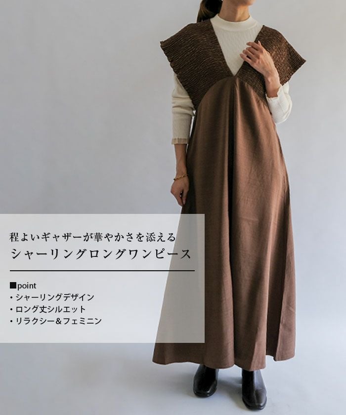 女性らしさを引き立てるシャーリングディテールが魅力のロングワンピース。