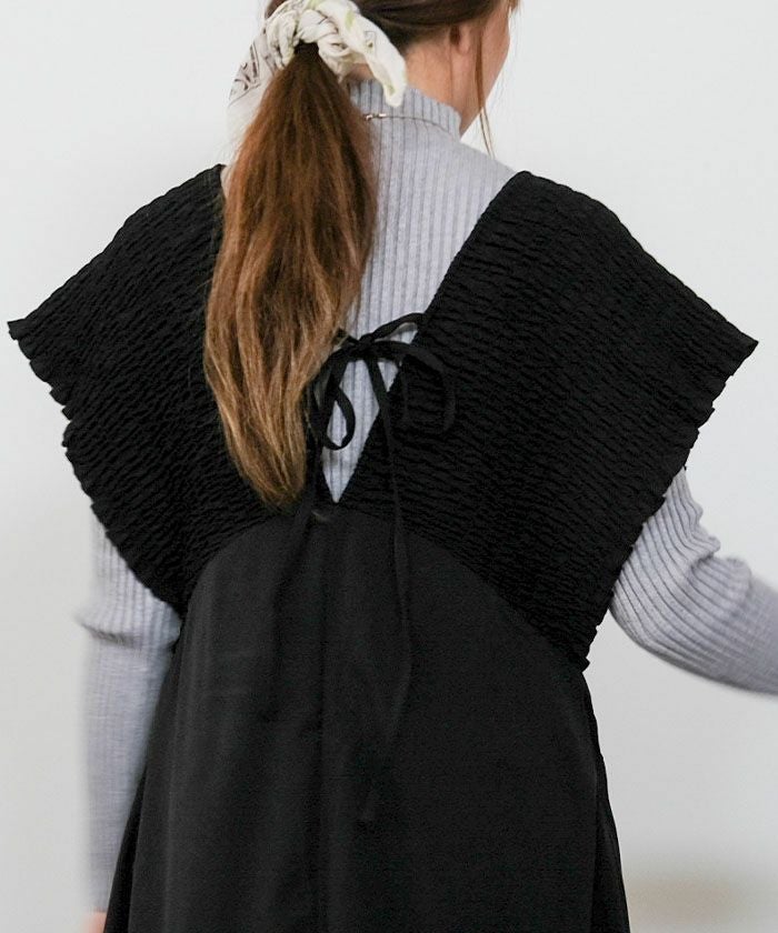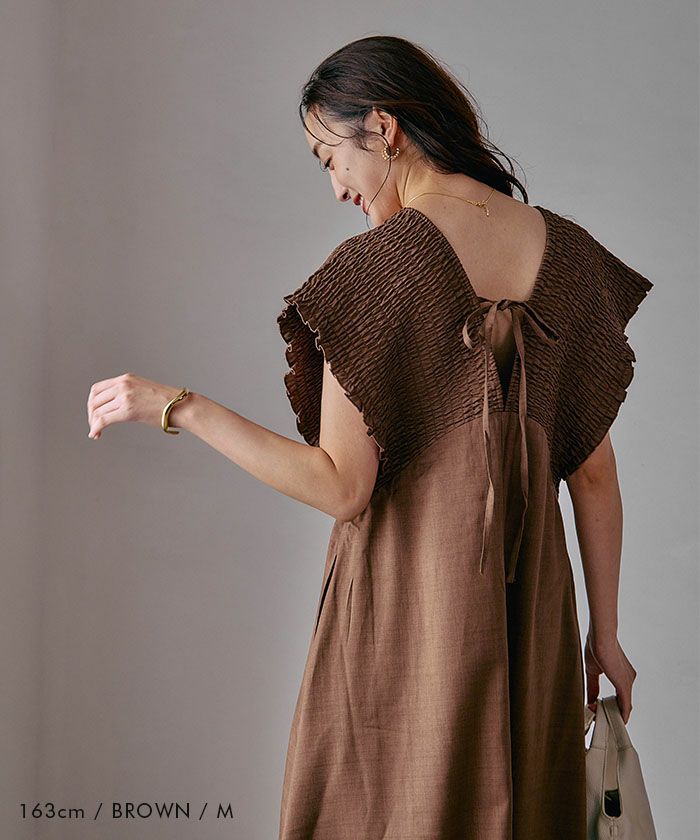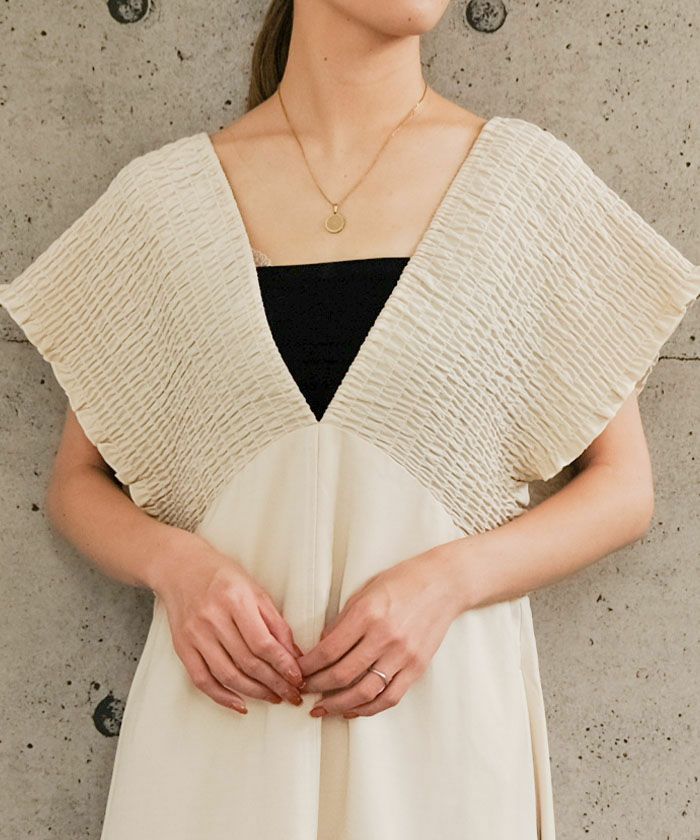 胸元やウエストに施されたシャーリングが自然にメリハリを作り出し、すっきりとしたラインを演出します。