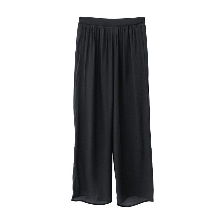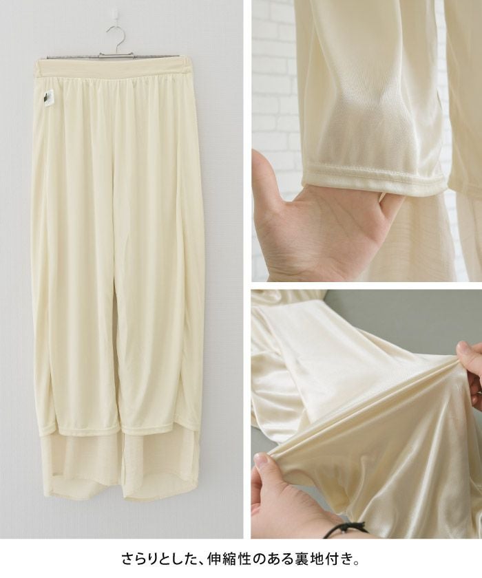 素材的に夏〜初秋くらいまでかなと思いますが、サラサラの着ごごち、安っぽくないほどよい光沢感、安っぽくないウエストのゴムの感じ、めちゃくちゃ高みえパンツでした。 縫製も、安物特有の雑な感じや、ガタガタ感なく、問題なさそう。 まだ洗濯をしてないので、洗った後のシワの感じやアイロンのかけやすさなどは、まだ不明ですが、今のところおすすめしたい商品のひとつでした。