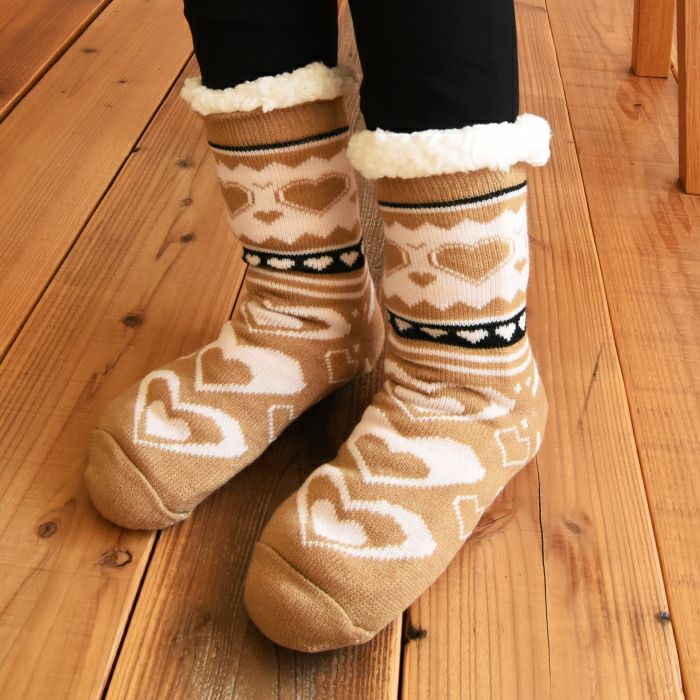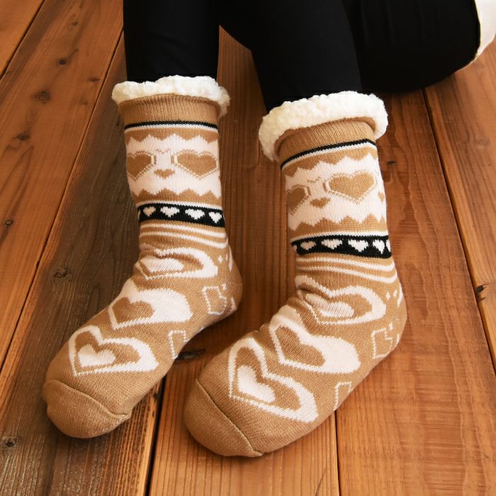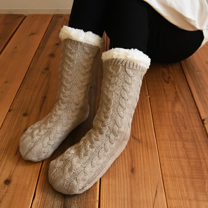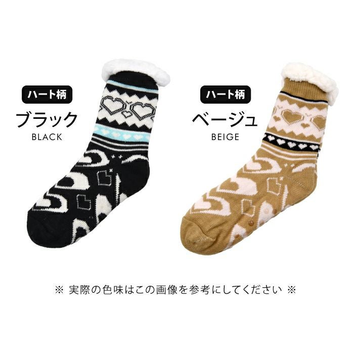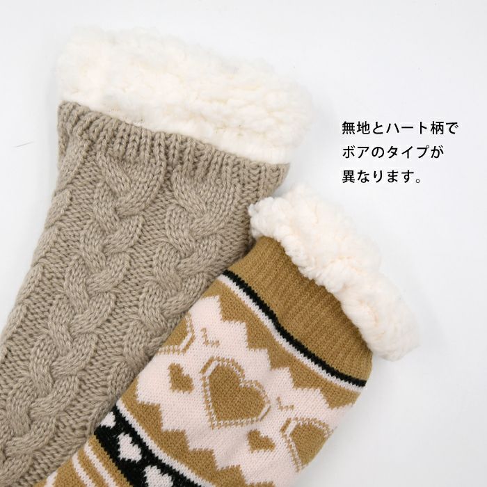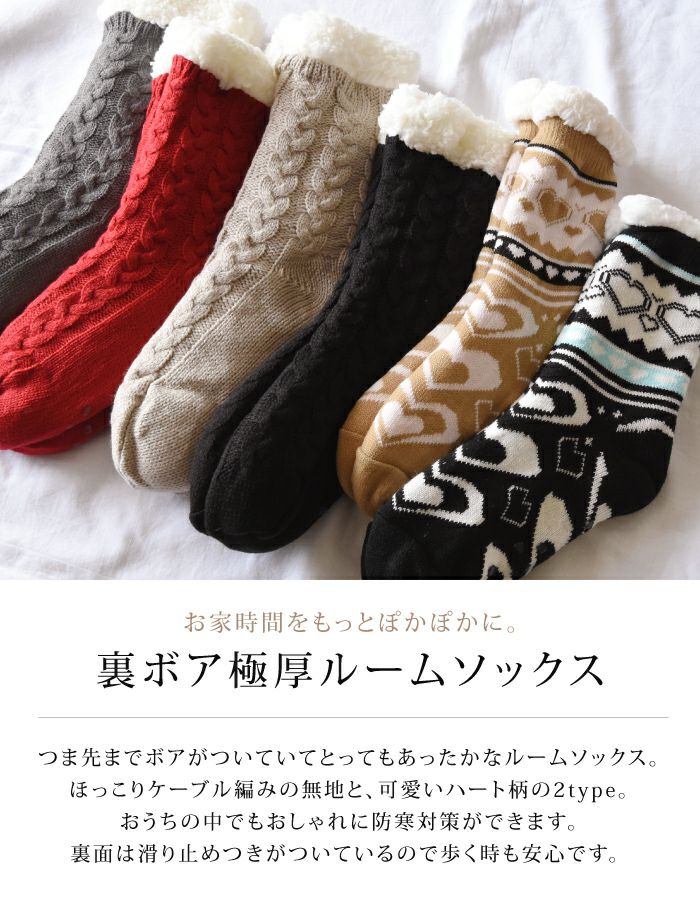 つま先までボアがついていてとってもあったかなルームソックス。ほっこりケーブル編みの無地と、可愛いハート柄の2type。おうちの中でもおしゃれに防寒対策ができます。裏面は滑り止めつきがついているので歩く時も安心です。