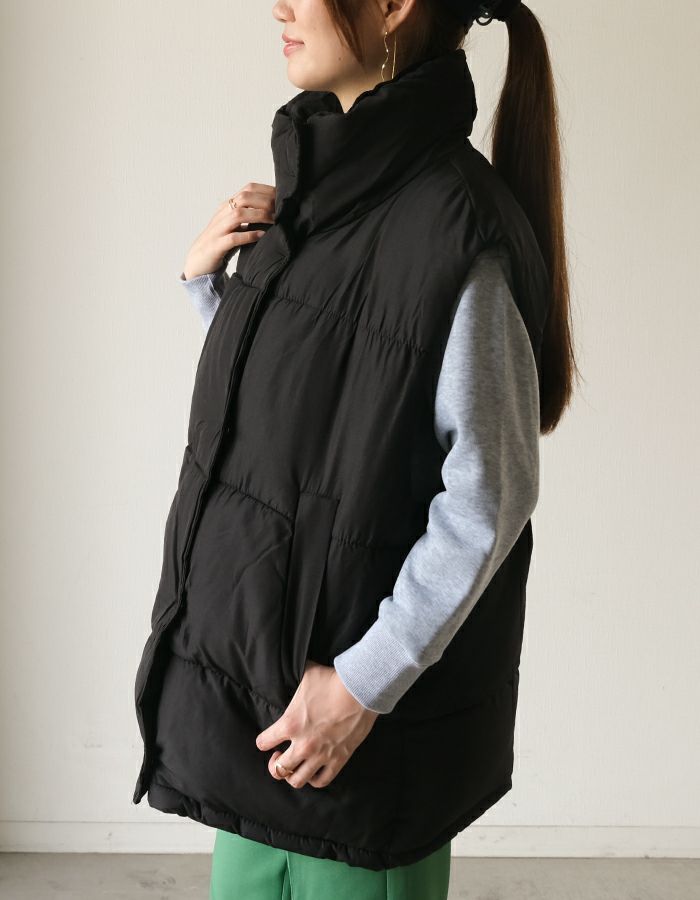 中綿たっぷりでボリューム感のあるファイバーダウンベスト。 オーバーサイズなので、中に厚手のニット等も着用いただけます。 ボリューミーなのに軽くて、風を通さず暖かいのが嬉しいポイント。 裾のドロストコードを絞って、違ったシルエットも楽しめます。 首の上あたりまで襟があり、マフラー無しでも暖かく着られます。