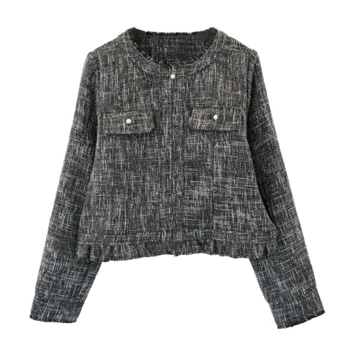 • 涼し気な素材感のサマーツイードノーカラーフリルジャケット