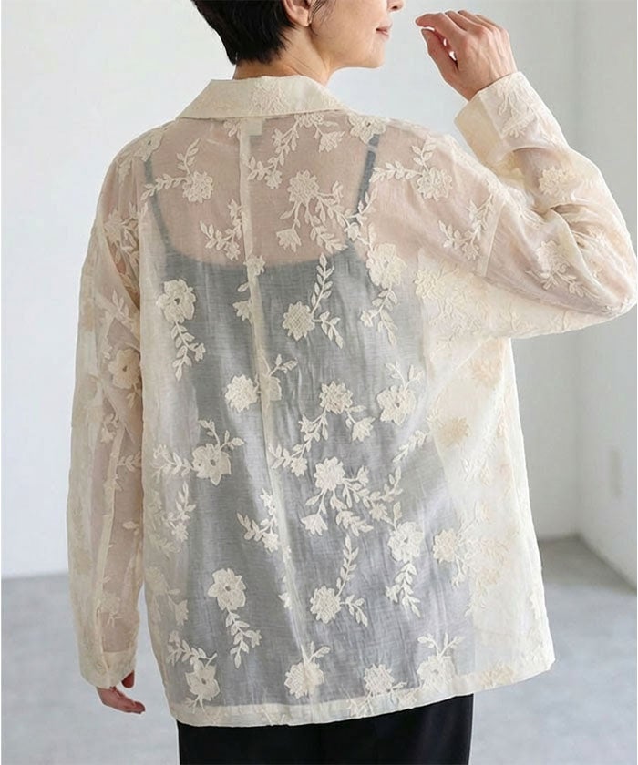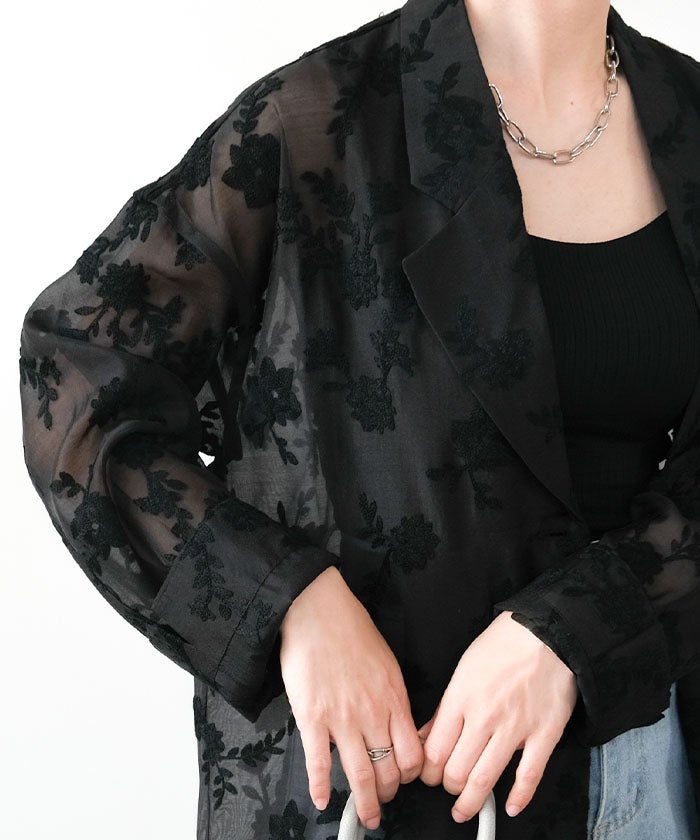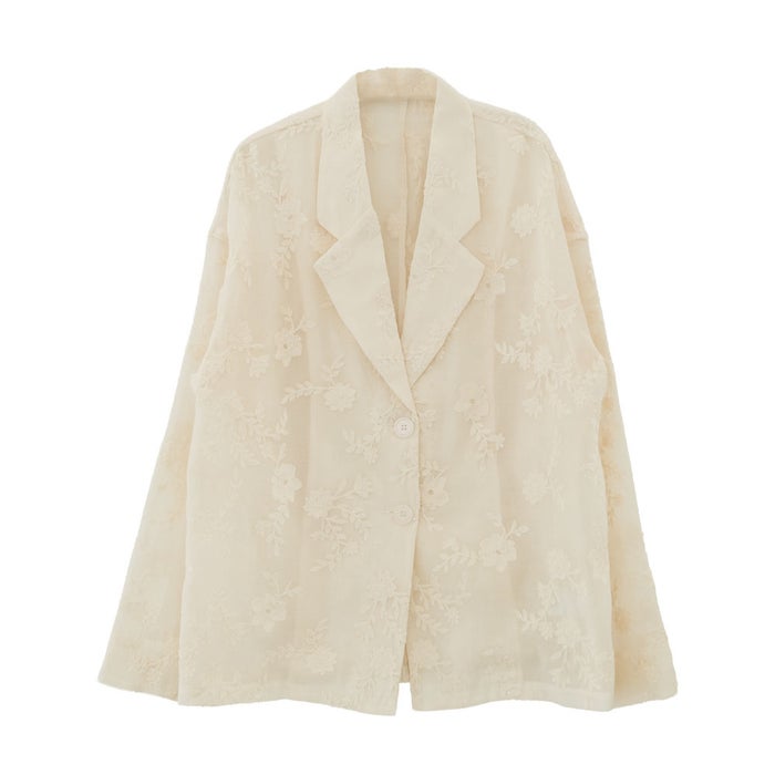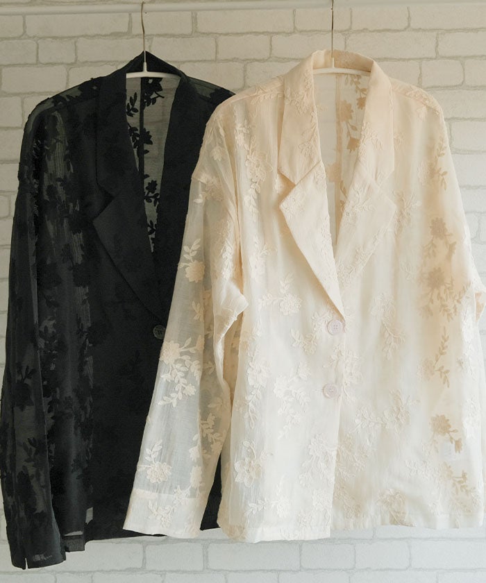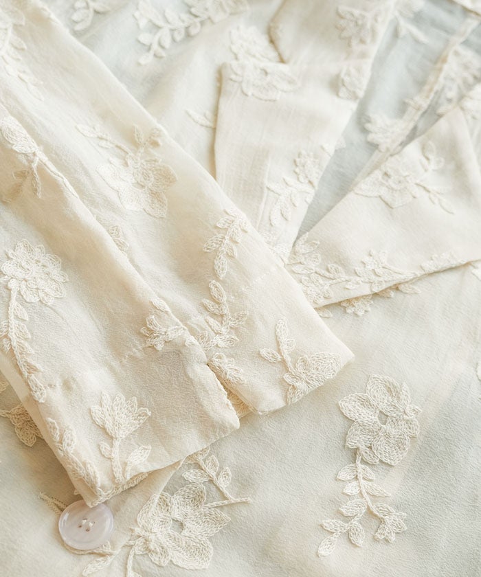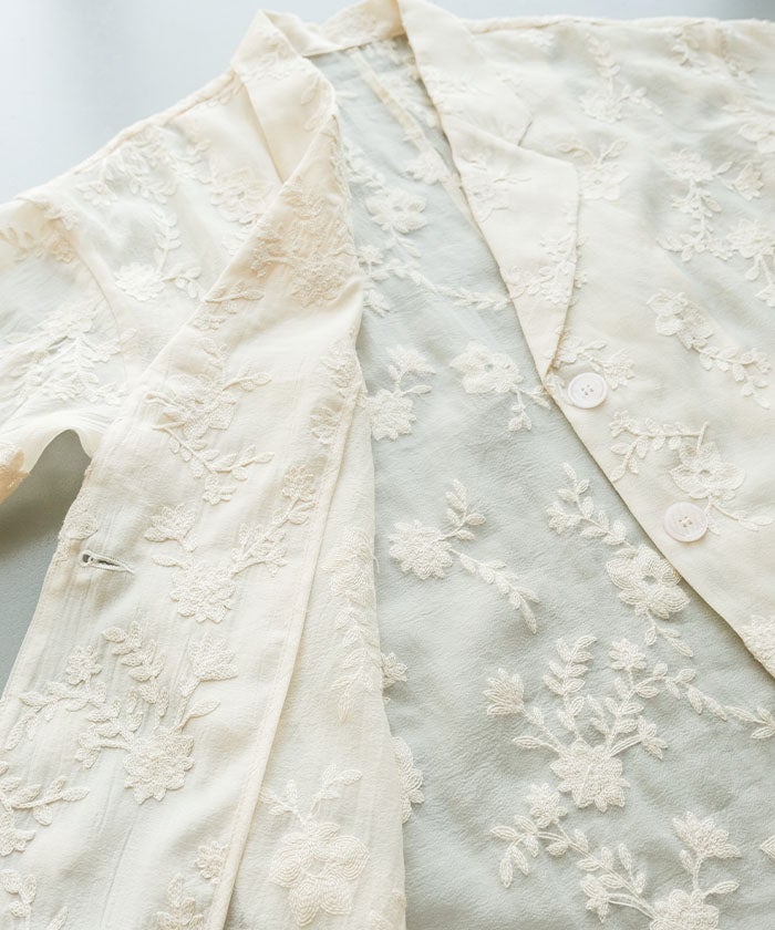 クラシカルなテーラードジャケットに、立体感のある花柄刺繍をあしらった存在感のあるデザイン。
