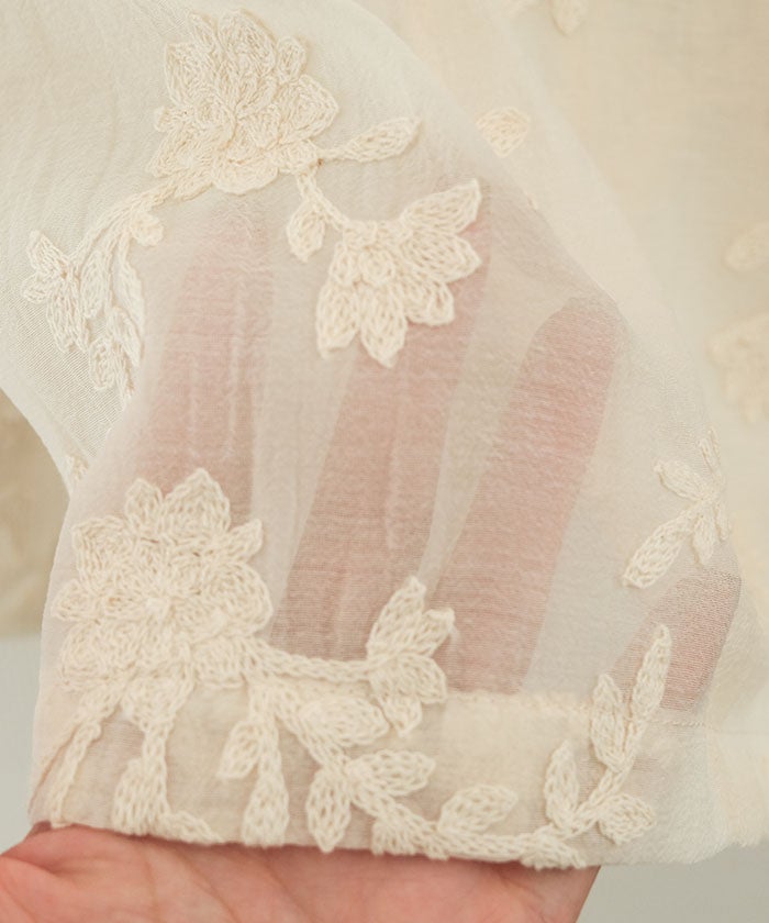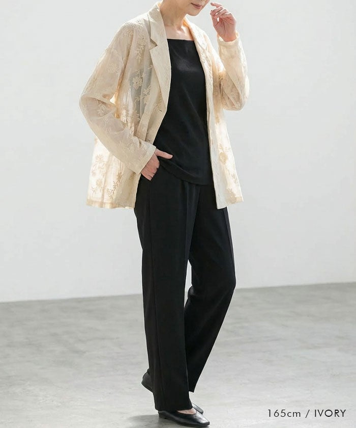 ベースはすっきりとしたシルエットで、きちんと感を大切にしながらも、刺繍のやわらかな表情が女性らしさを引き立ててくれます。