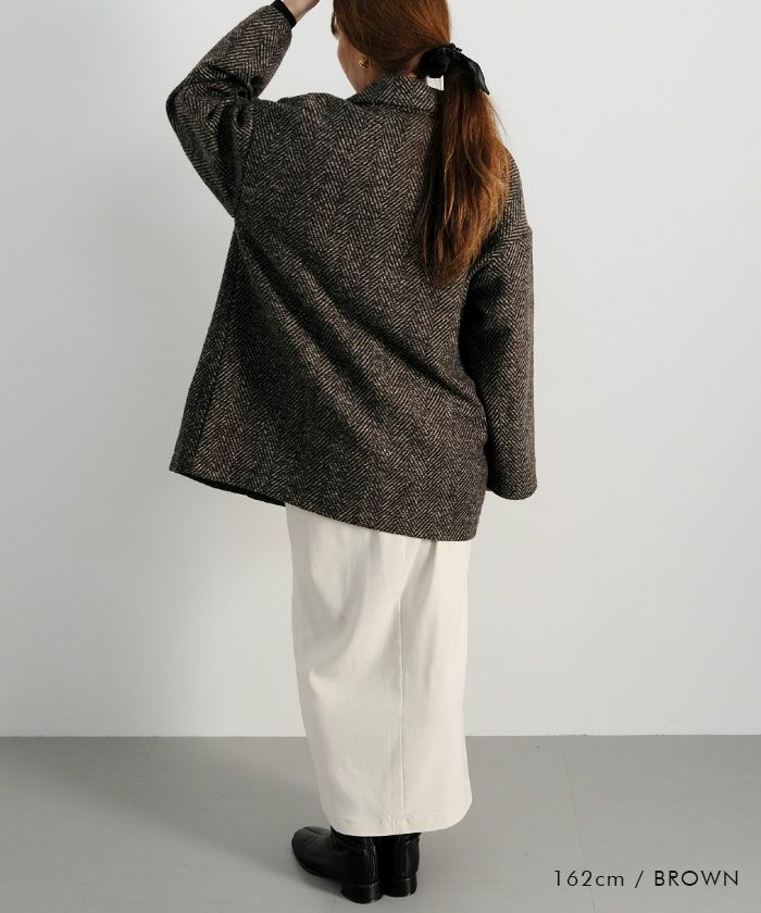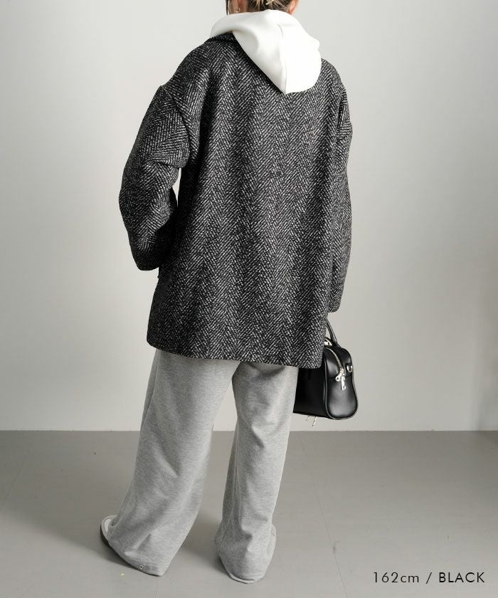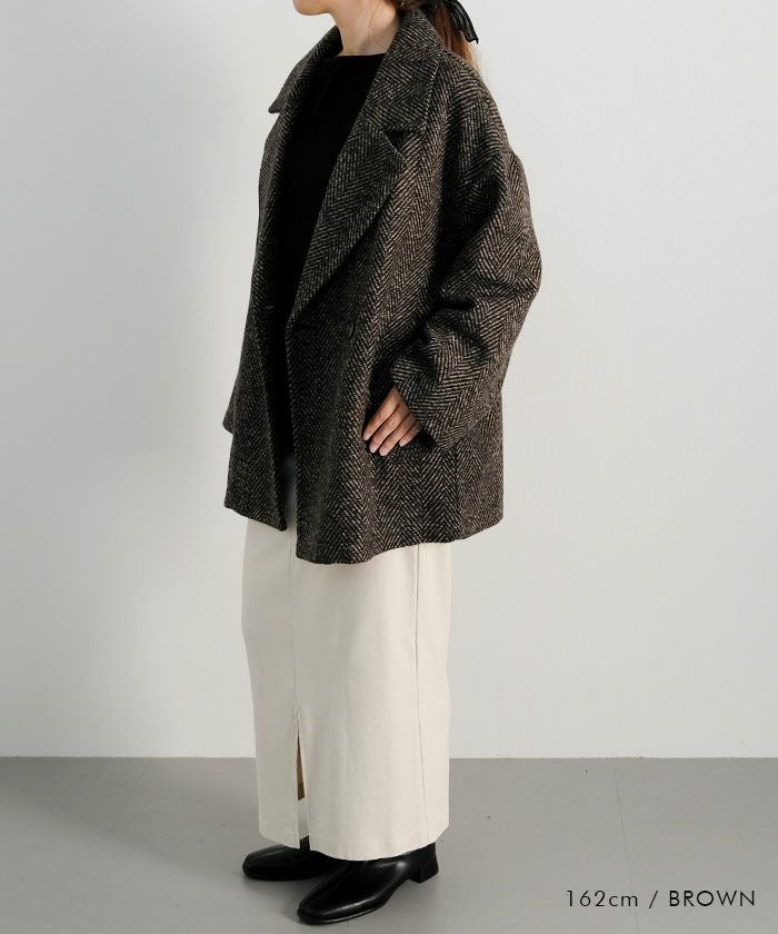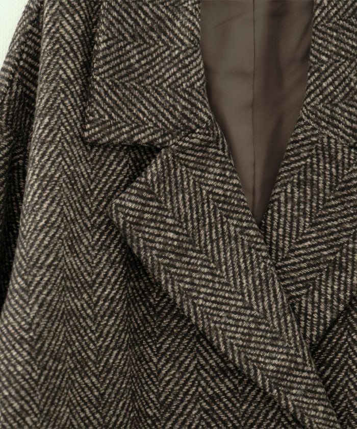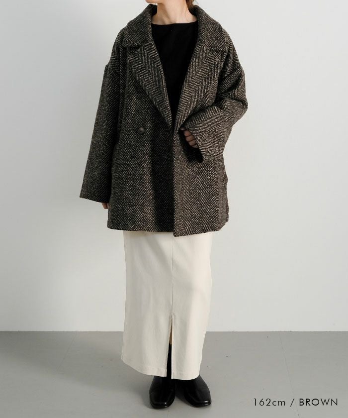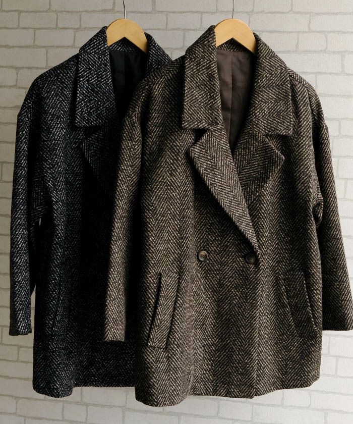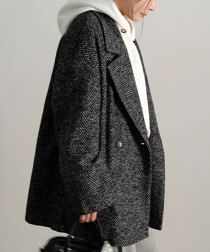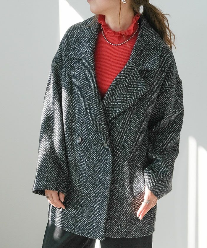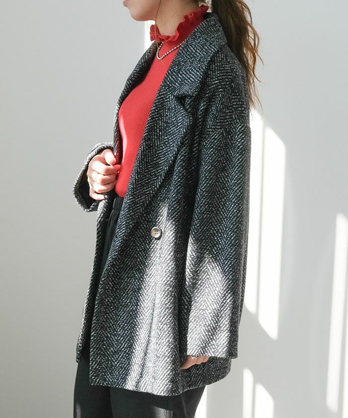 上品なムードを漂わせるヘリンボーン柄のダブルテーラードジャケット。