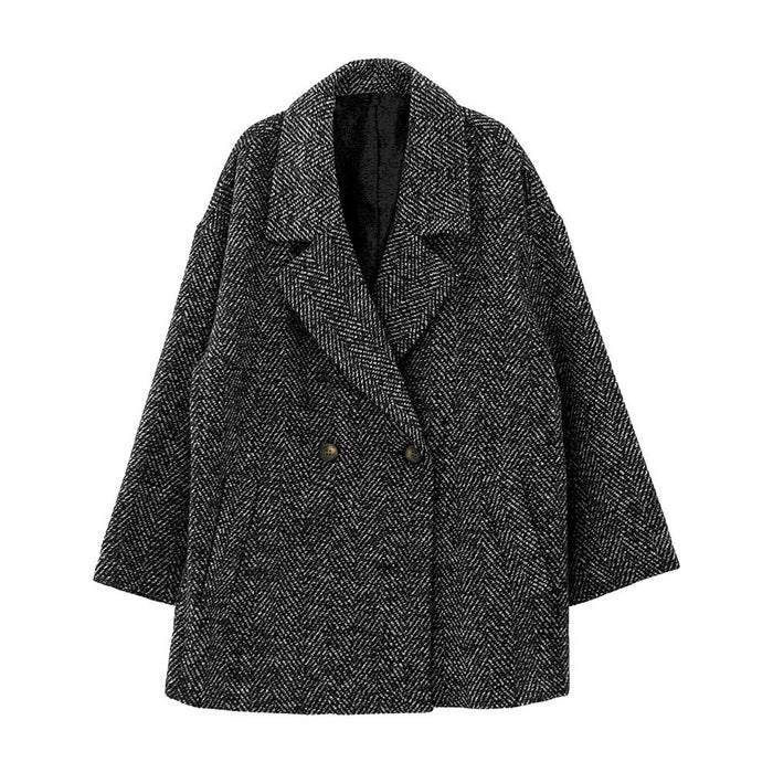 ダブルのフロントデザインがクラシカルな雰囲気を演出しつつも、堅くなりすぎないやわらかな生地感で、女性らしさを引き立てるバランスに。
