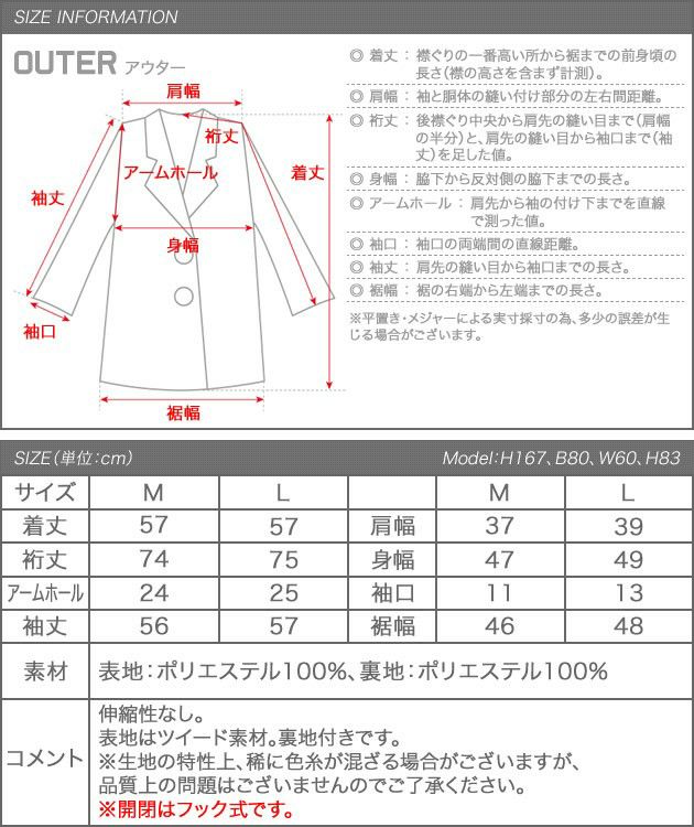 注文してからすぐ届きました♪ 想像以上に生地がしっかりしていて ツイードのデザインも可愛いです♡ 161㎝−56㎏でLサイズ 丁度いいサイズ感です! 買ってよかったです‼︎