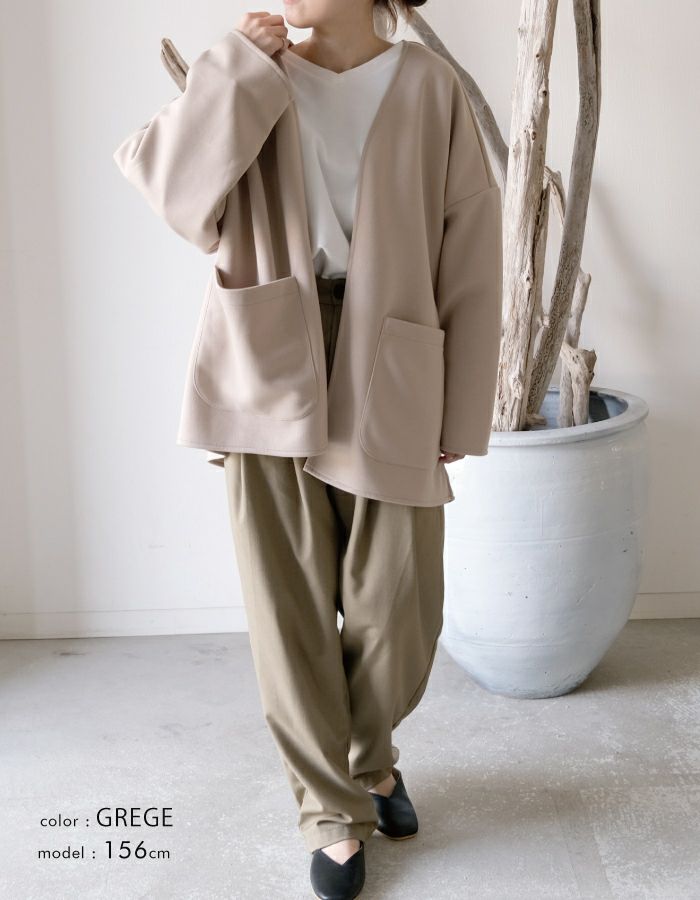 伸縮性のある程よい厚みのポンチ生地が着心地◎ノーカラーのVネックが首元をすっきり見せてくれます。くすんだ色味がお洒落で、コーデに取り入れやすい一着です。