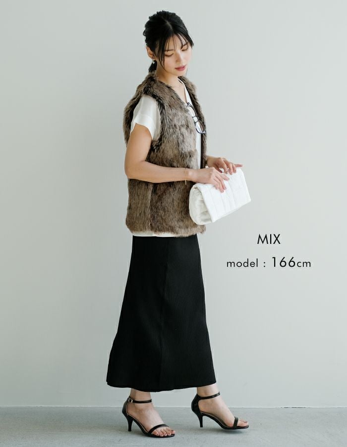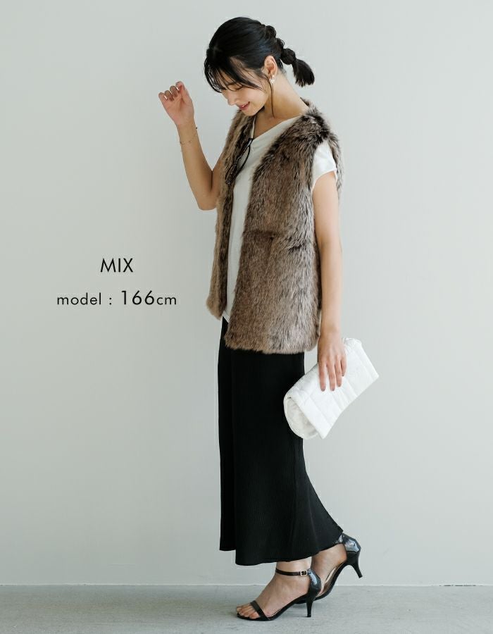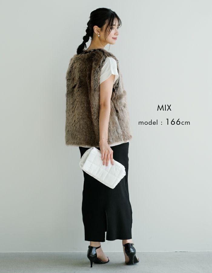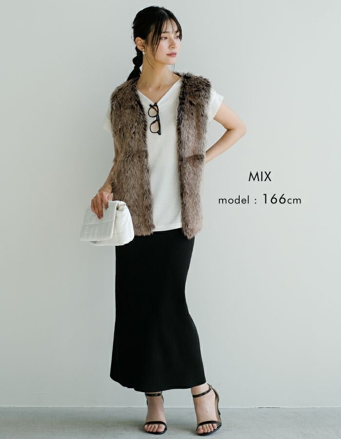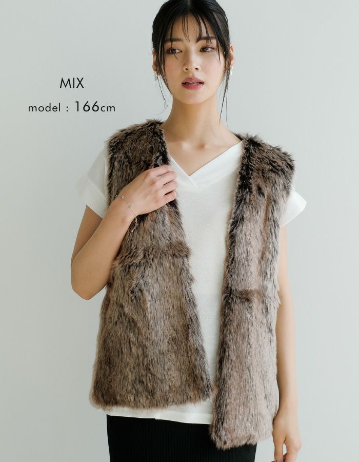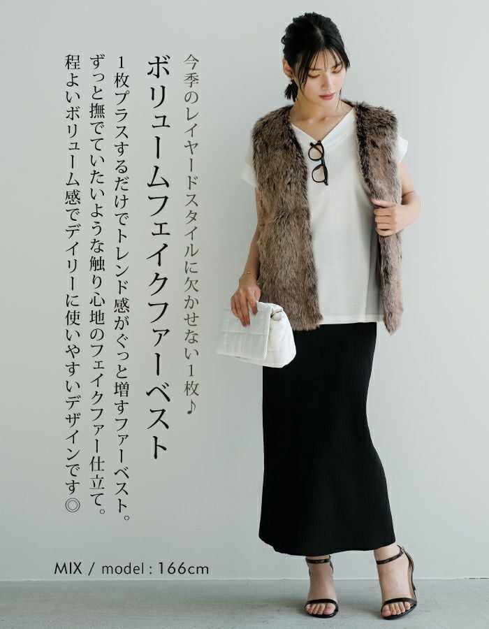 1枚プラスするだけでトレンド感がぐっと増すファーベスト。 ずっと撫でていたいような触り心地のフェイクファー仕立て。 程よいボリューム感でデイリーに使いやすいデザインです。