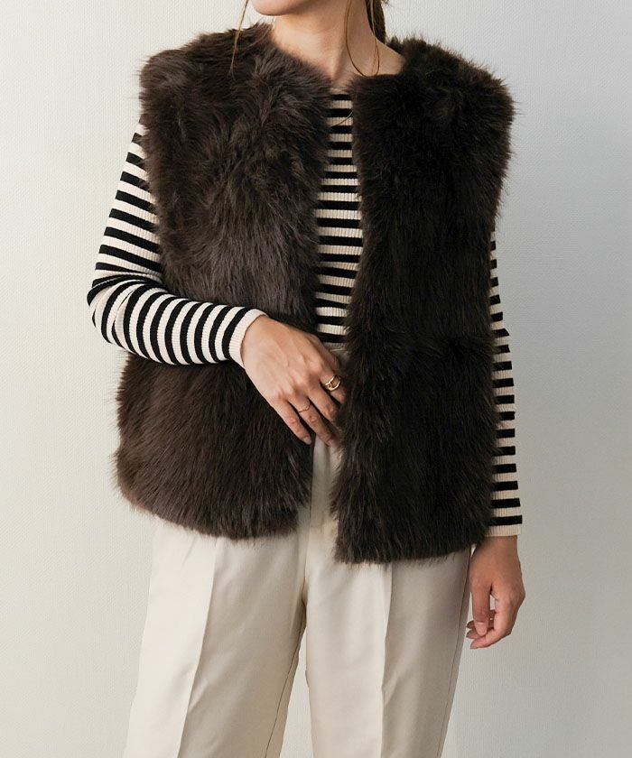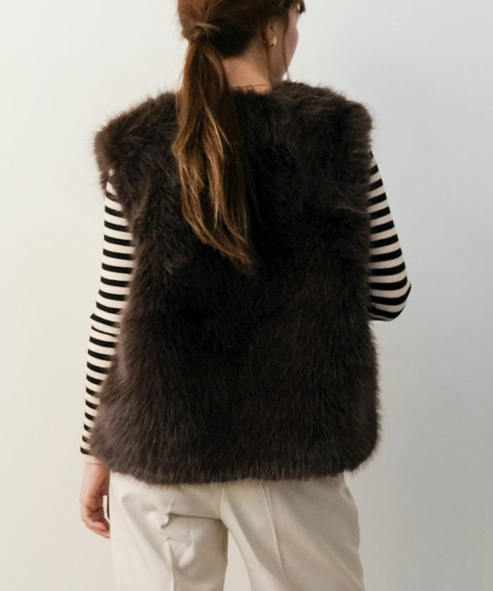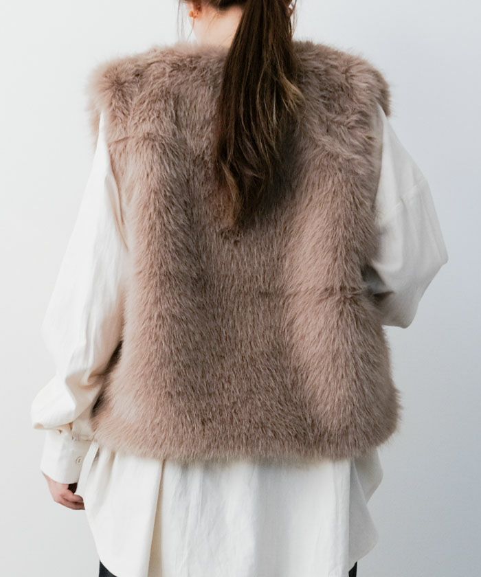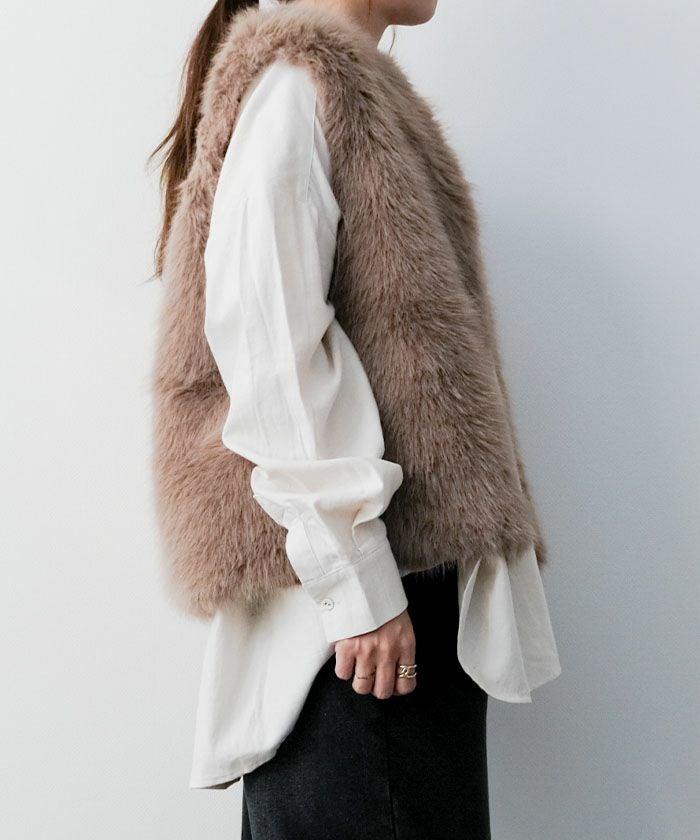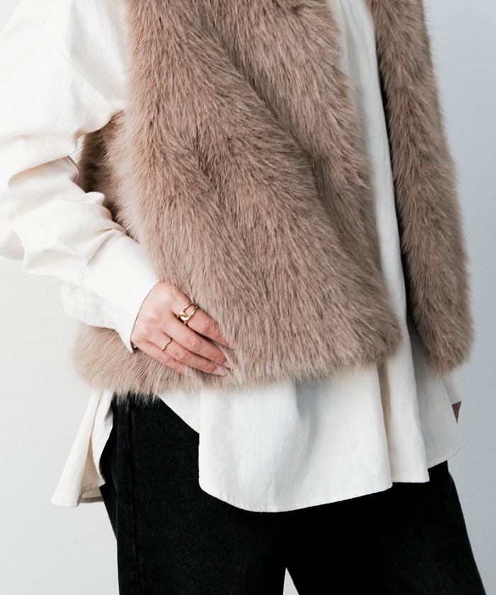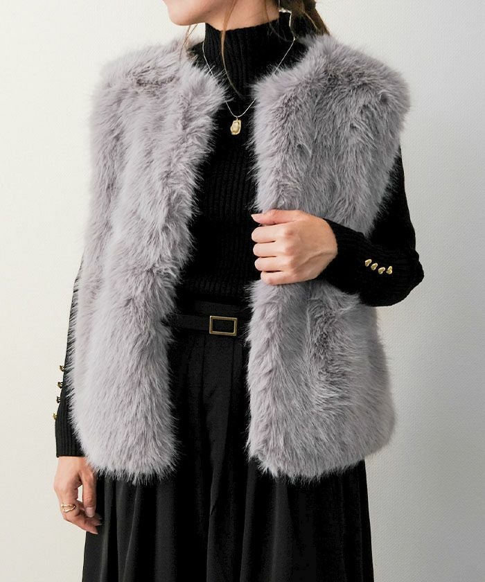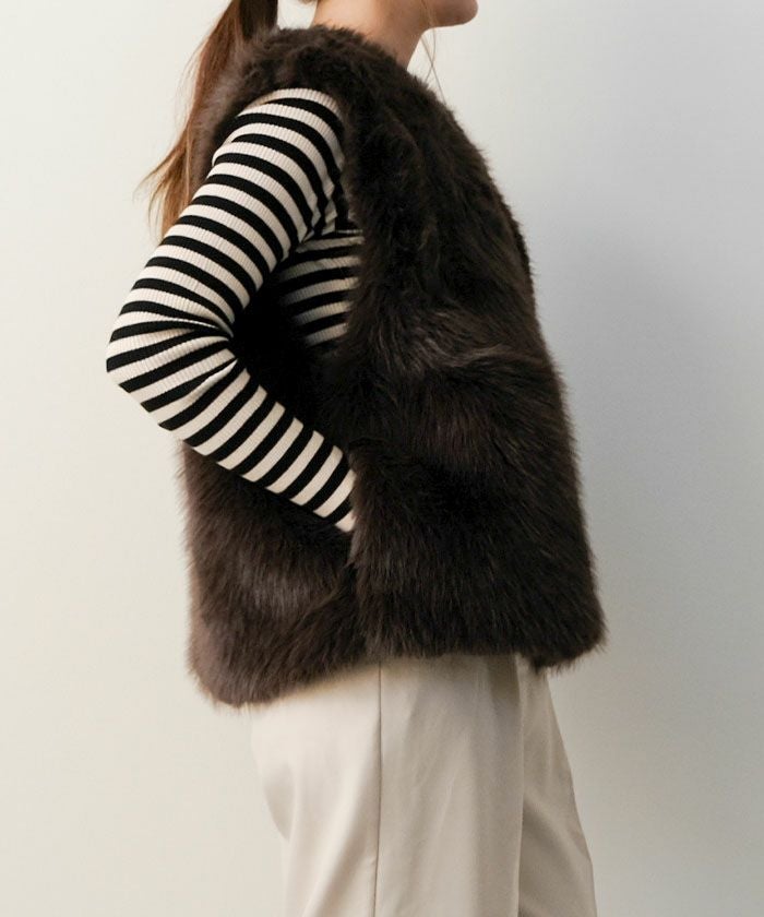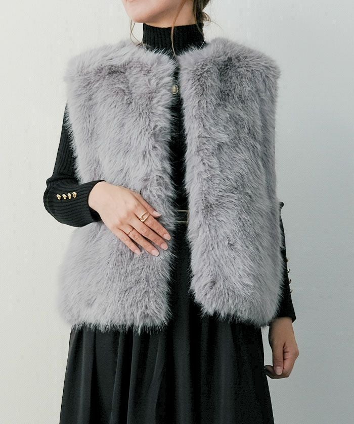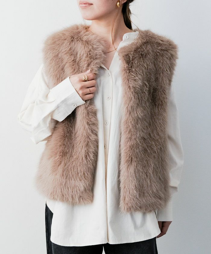 思わず触れたくなるような、ふんわり柔らかなフェイクファーをたっぷりと使用したジレ。