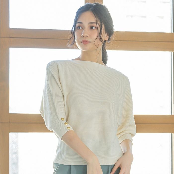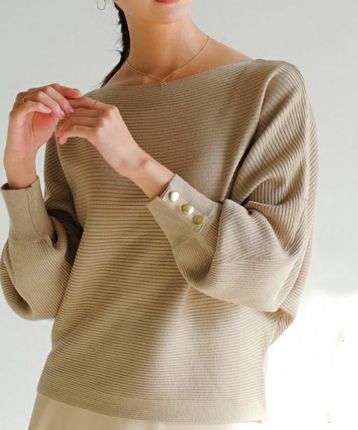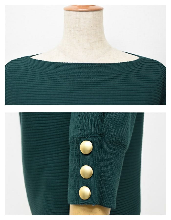 スッキリとしたボートネックに袖のゴールドボタンが映えるトップス。