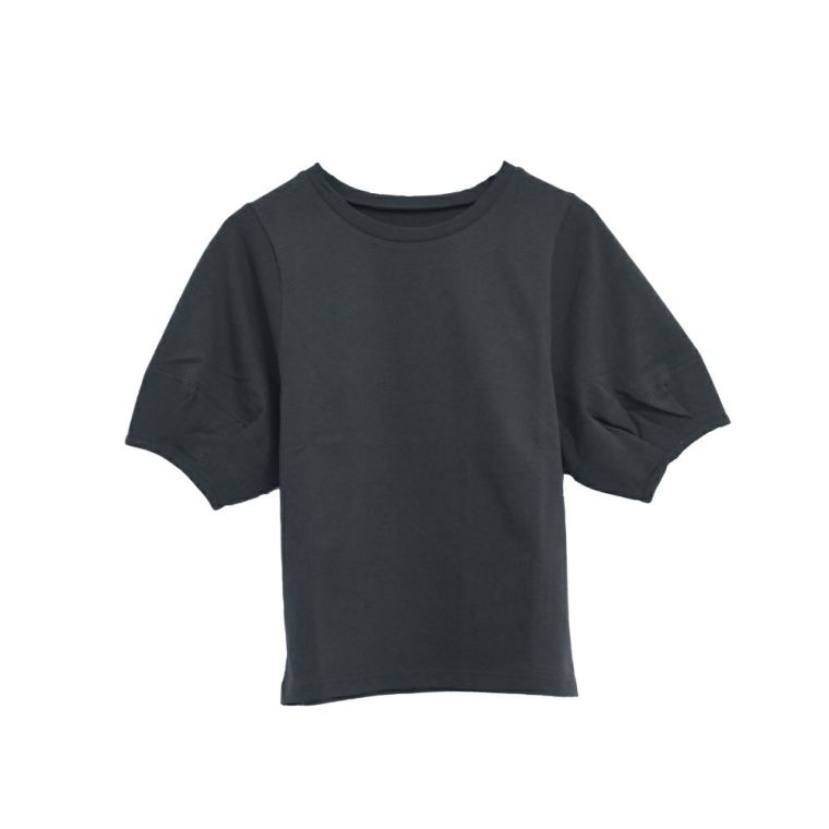 袖にギャザーを施したボリュームデザインがフェミニンな印象。