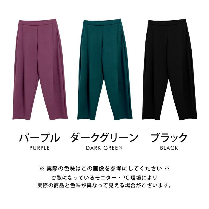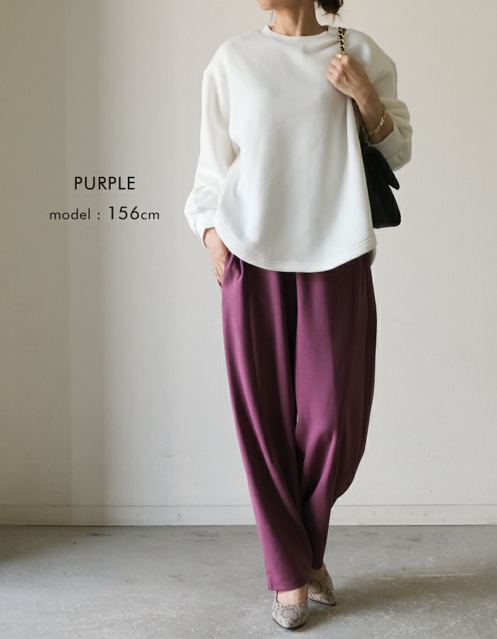 黒を買い、すごく気に入ったのですぐに緑も買いました。 裾が広がりすぎないワイドパンツな感じです。 迷ってLを買ったら大き過ぎたけど、ブカブカなラインがかわいくて、買い足しもLにしました。 追記 お気に入りで3色(+予備も)買いました。 前がタック無しですごくキレイです。 今はMしかないのでMを買っていますが、Mでも大きめです。 太って見えるわけではなく、キレイなラインです。 紫は、写真より明るめです。サツマイモとか、デラウェア(ぶどう)とか、そんな感じの色で、少し難しいと思います。