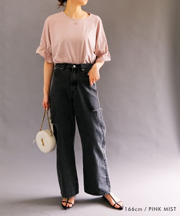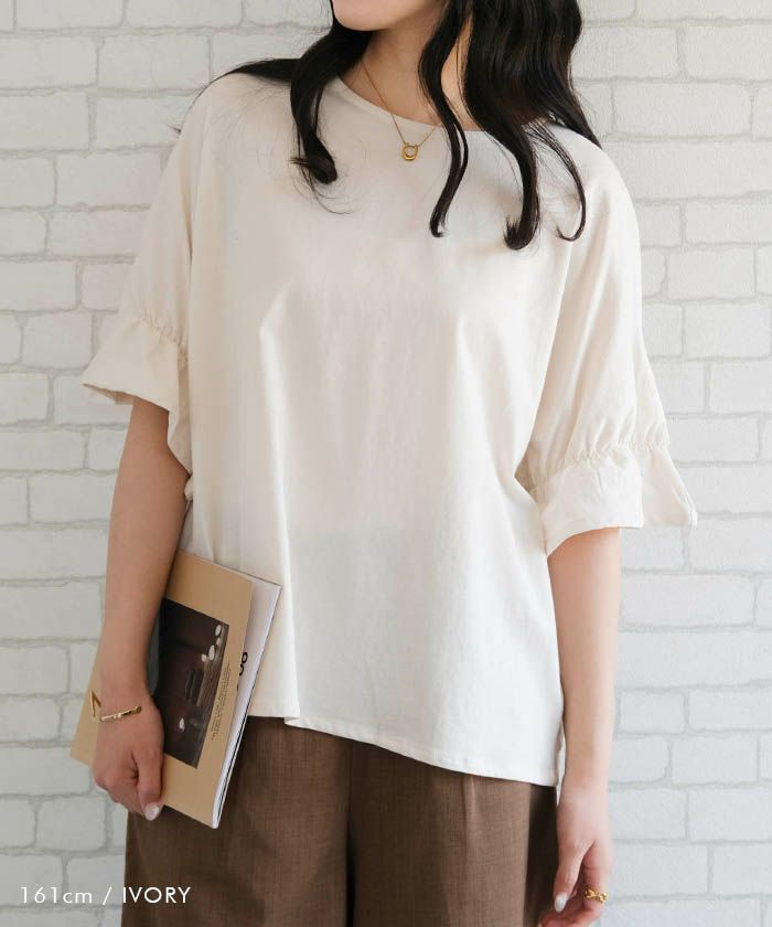 • 袖ギャザーで二の腕をスッキリ華奢魅せ!ギャザーフリル袖カットソー