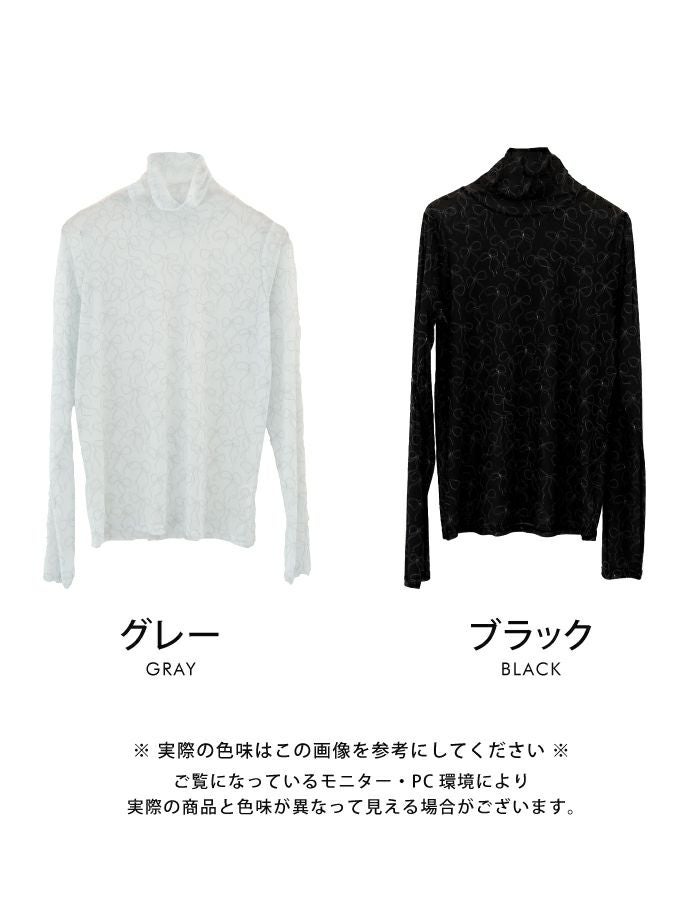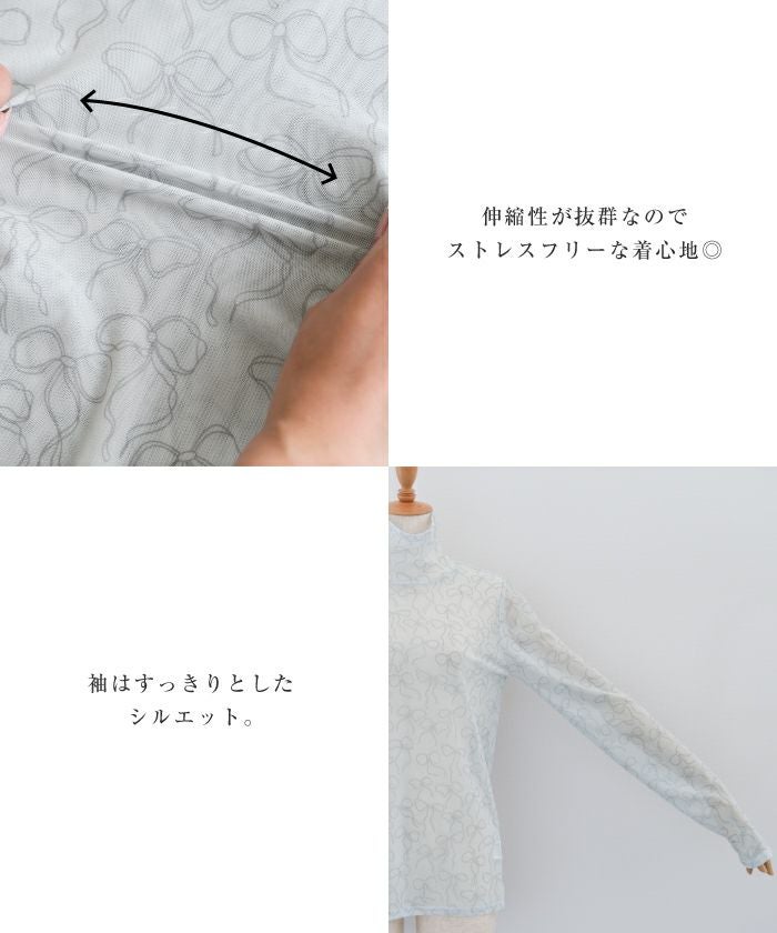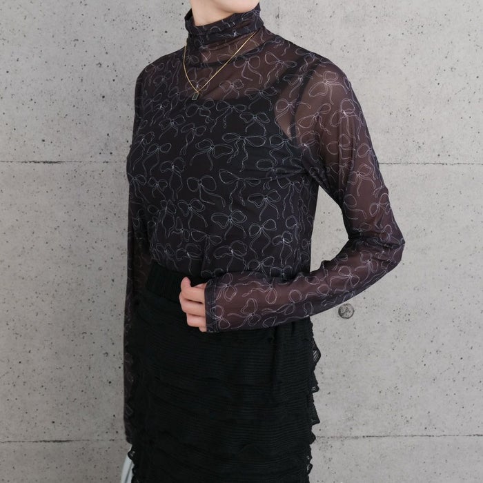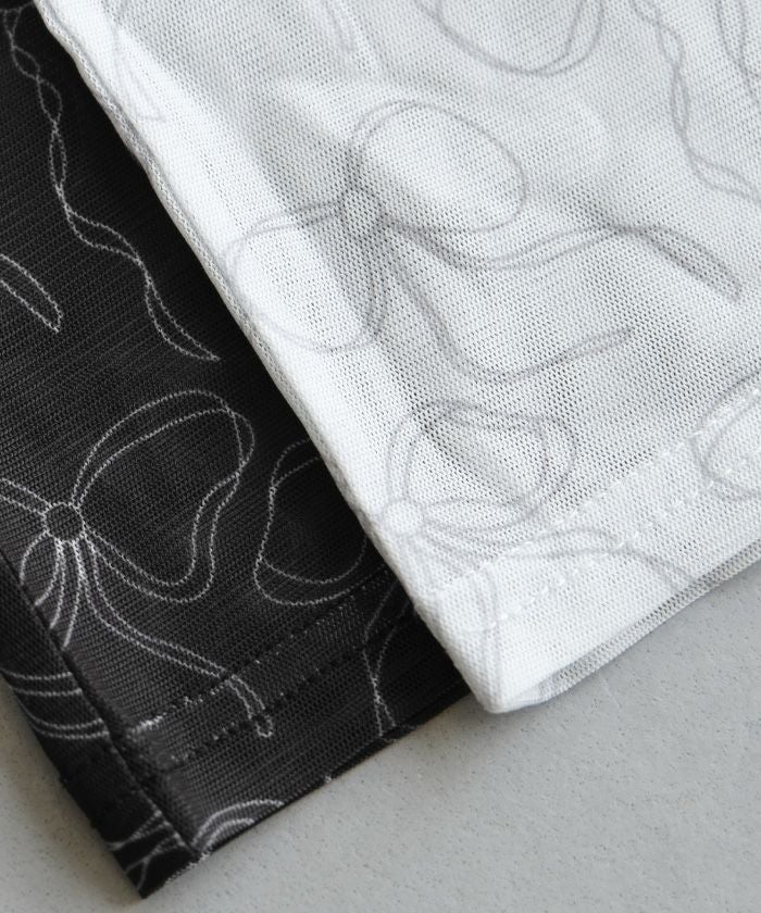 • リボン柄プリントの総柄が目を惹く、シアートップス