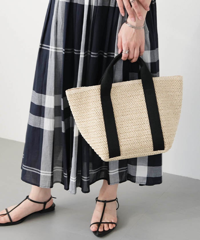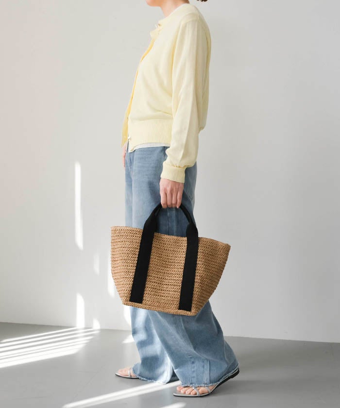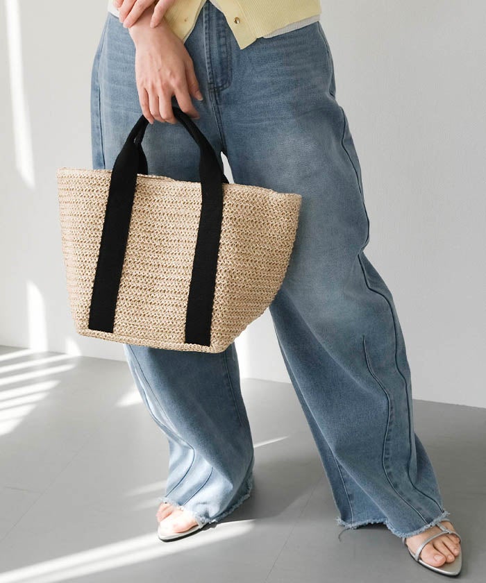 ナチュラルな雰囲気を楽しめる雑材素材を使用した、シーズンムードたっぷりのテープハンドルトートバッグ。