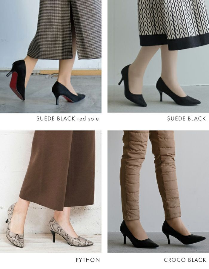 足をすっきり見せるポインテッドトゥと、程よい高さの細ヒール。