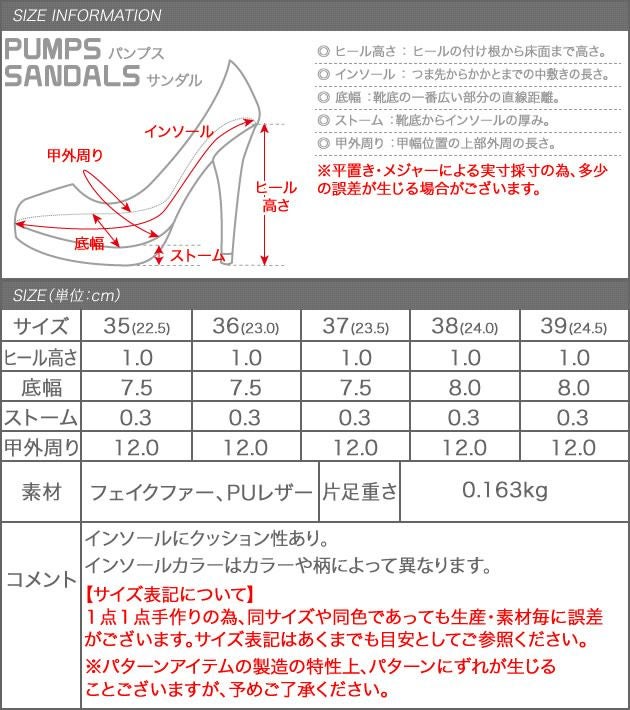 ヒール高さ:1.0cm 底幅:7.5cm ストーム:0.3cm 甲外回り:12cm