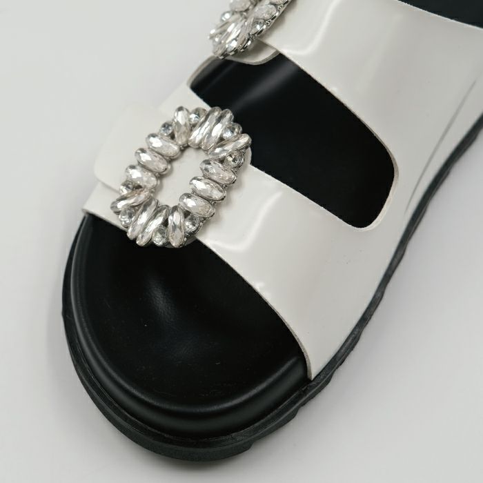 大きなビジューバックルが目を惹くダブルストラップサンダル。 インソールはクッション性があり、ふんわりソフトな履き心地。 ストラップでしっかりホールドされ、脱ぎ履きが簡単なのも◎