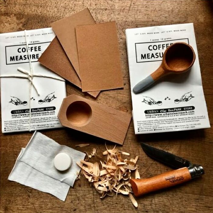 コーヒー豆や、粉の量を計るメジャースクープを作るキット。 お茶や紅茶葉、粉砂糖など、さまざまな用途にご使用頂けます。 カッターや小刀、付属のサンドペーパーを使って好みの長さや太さの形を作り、仕上げに付属の天然自然原料『蜜ろう』を塗って磨きます。 世界に1つだけのコーヒーメジャースクープのできあがりです。