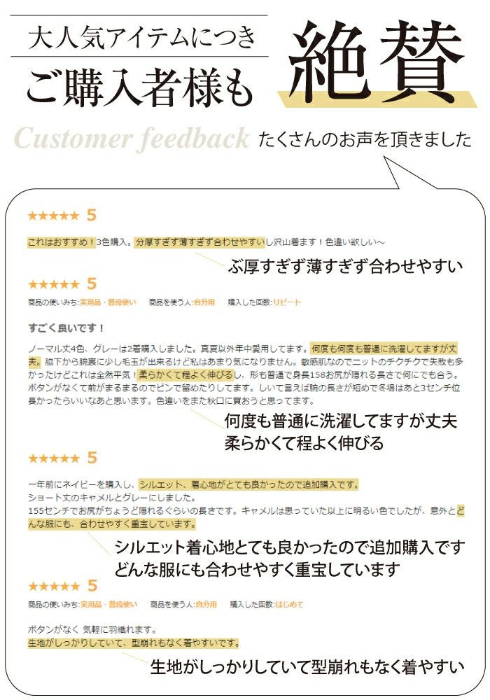 キャメルのノーマル丈を購入しました。思っていたより生地がしっかりしていて、丈もちょうど良く、これからからの季節、たくさん活躍しそうです。