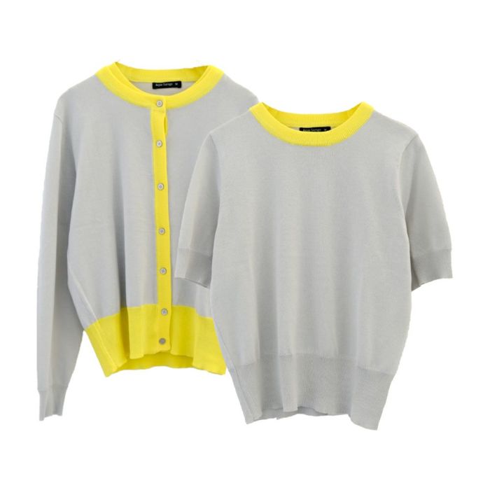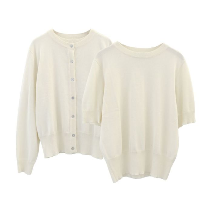 半袖ニットと長袖カーディガンがセットになった万能アンサンブル。