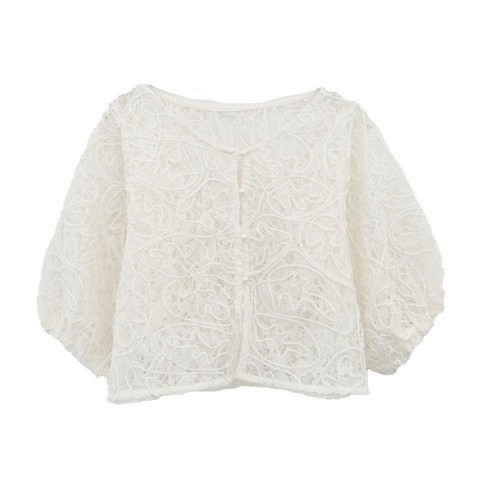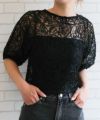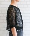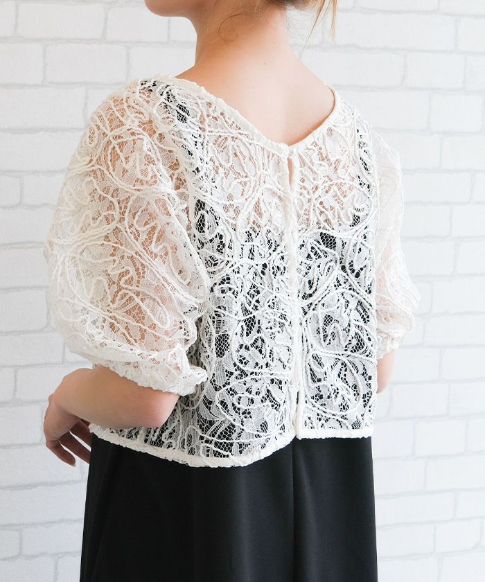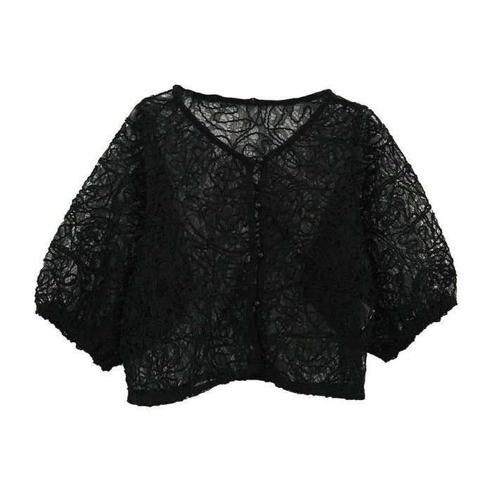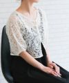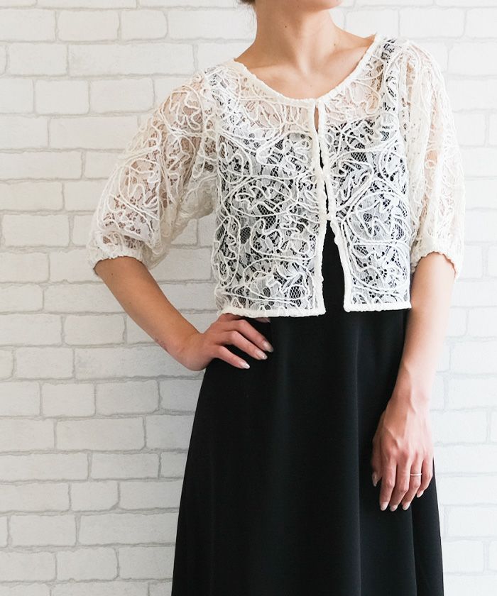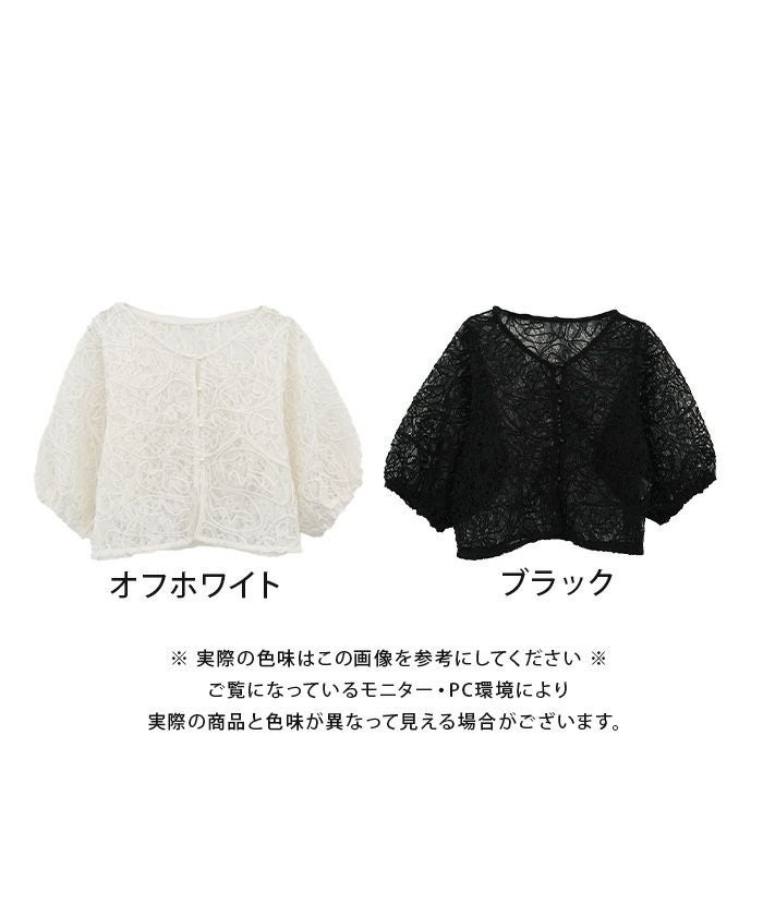 上品なコードレースのパフスリーブが特徴のカーディガン。