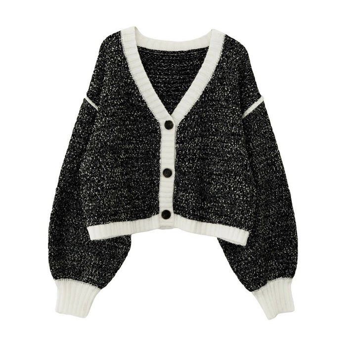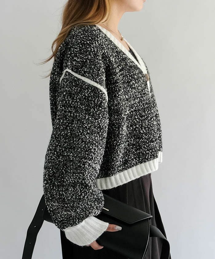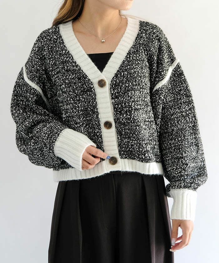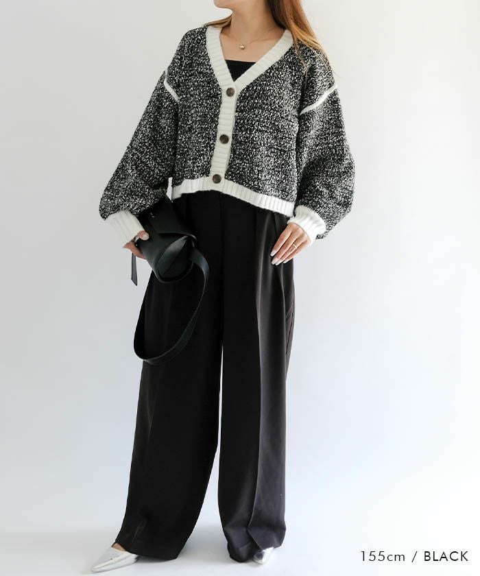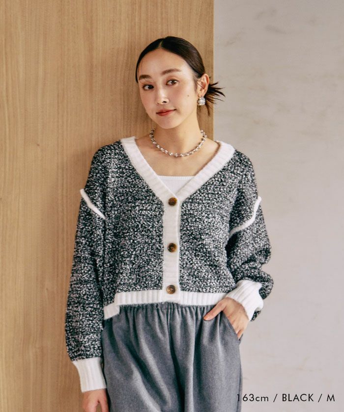 配色糸をやわらかく編み込んだショート丈ニットカーディガンは、羽織るだけで全体のバランスを美しく整えてくれるアイテム