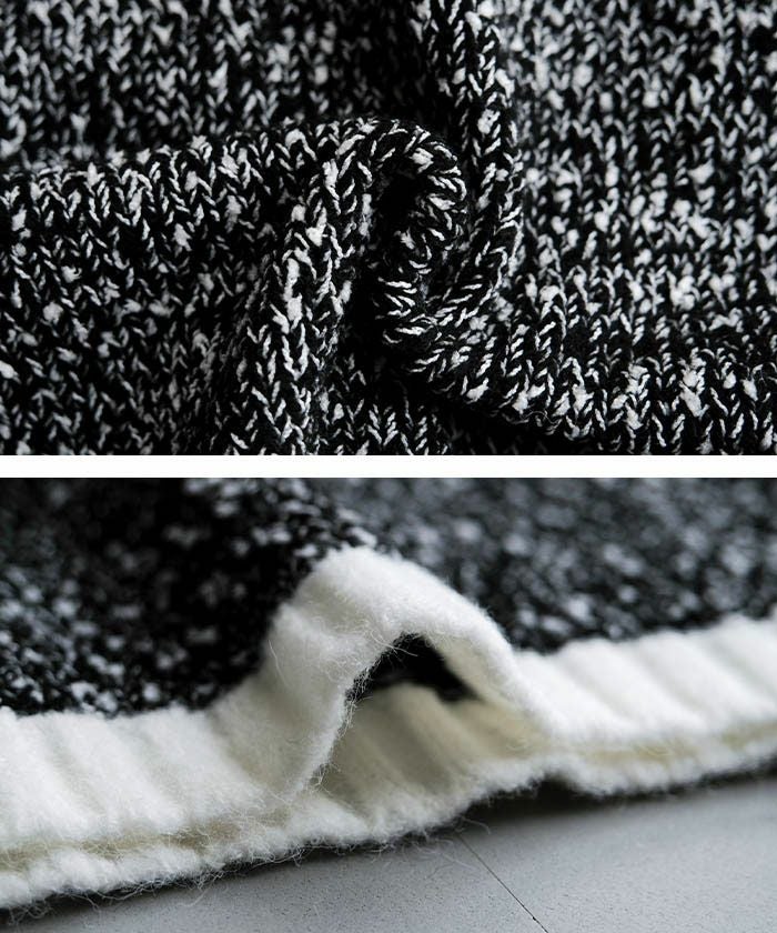 カラーミックスの編地が表情豊かで、シンプルなインナーと合わせても華やかさを添えてくれる素材感です。