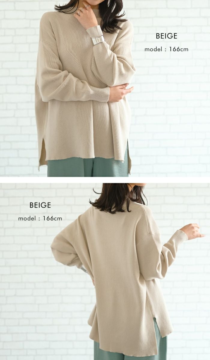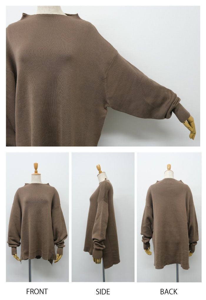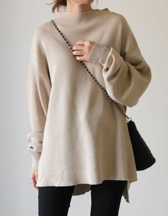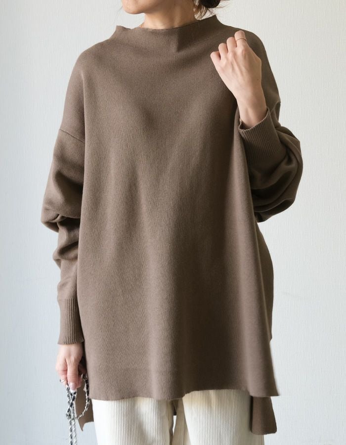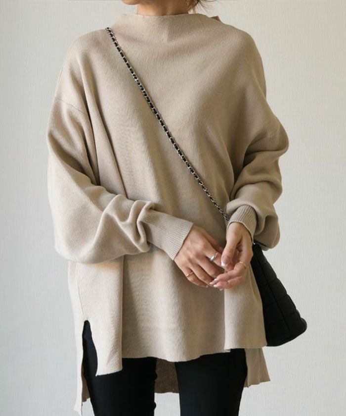 スウェットのようなリラックス感のある着心地のニットトップス。 ニットのチクチクが苦手な方でも着用いただける優しい肌触り◎ 伸縮性のあるニットで、ストレスフリーな着心地を叶えます。 短めのボトルネックなので、お顔周りをすっきりと見せてくれます。 丈はお尻が隠れる長さで、気になる腰回りもしっかりカバー♪ 着回しやすく、大人のカジュアルスタイルにピッタリなアイテムです。